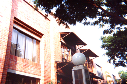 Plano medio. Toma realizada en contrapicado, donde se puede apreciar la fachada de varias viviendas, con muros de ladrillo a la vista. Se aprecia también, las ramas de un árbol frondoso.