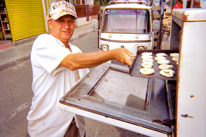 Plano Medio. Puesta en escena de un hombre realizando su labor como panadero. Dirige su mirada hacia la cámara mientras sostiene con su mano derecha una bandeja con pandebonos para llevar al horno. Al fondo se observa un motocarro.
