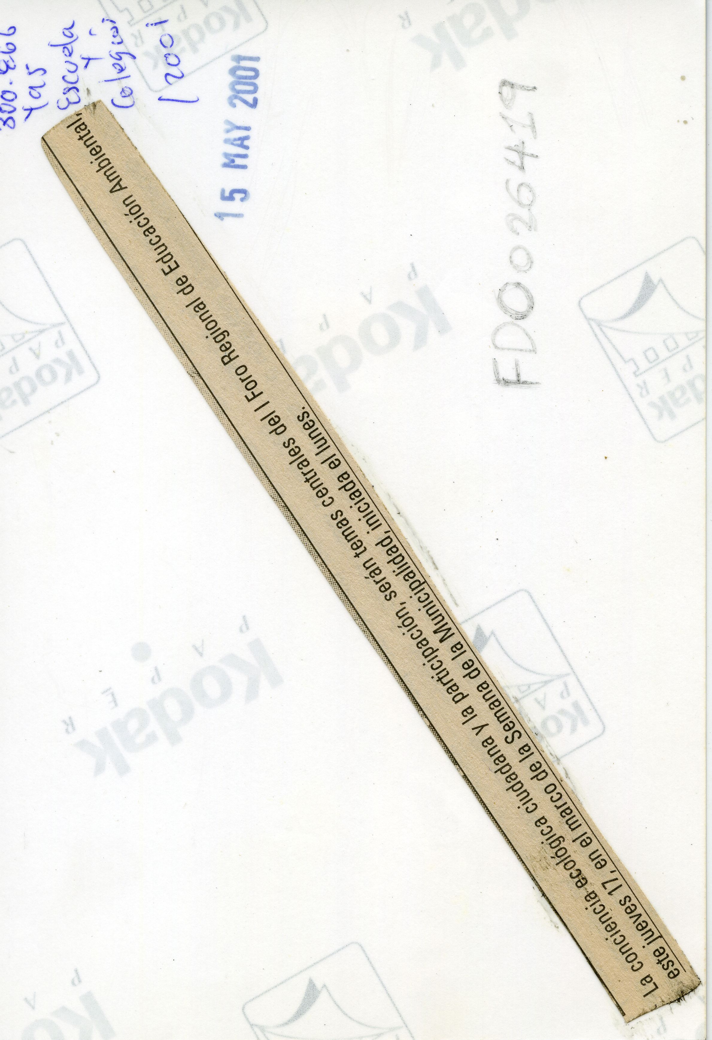 Al reverso de la fotografía se anexa recorte: La conciencia ecológica ciudadana y la participación, serán temas centrales del I foro regional de educación ambiental este jueves 17, en el marco de la semana de la municipalidad, iniciada el lunes.