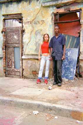 Plano Medio. Se destaca una pareja y de modo especial la fachada de una vivienda con paredes deterioradas y puertas destruidas cubiertas con tablas.