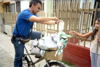 Plano medio. Exterior día. Panadero ambulante. Sobresalen líneas en fondo. Niña en costado lateral derecho. Expresión alegre.