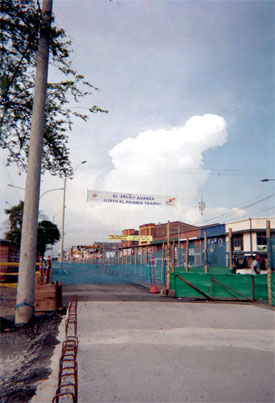 Plano general. Calle MIO. Fracción azul superior opuesta a la calle. Poste de energía y calzada convergen en costado inferior izquierdo.
