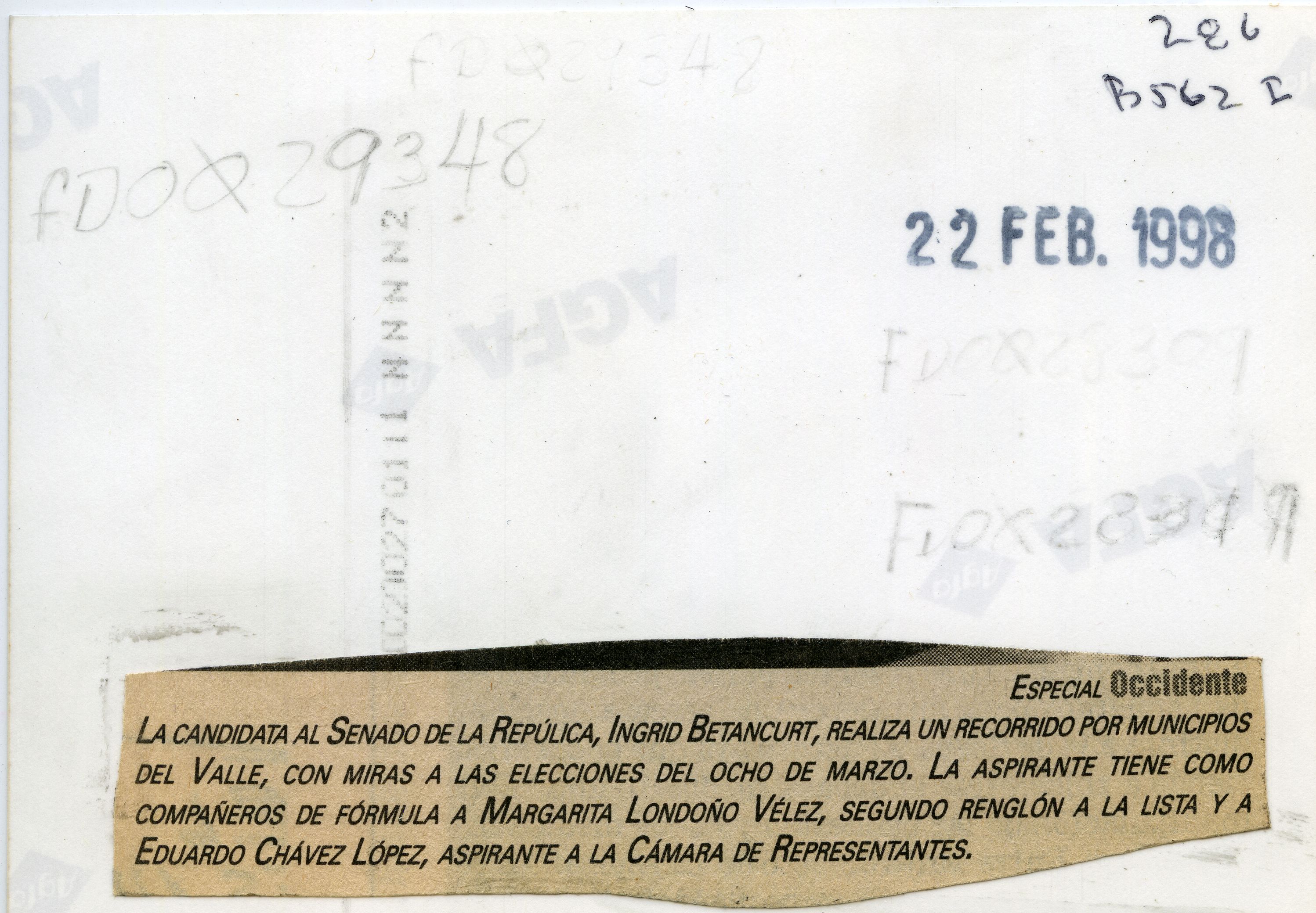 LA CANDIDATA AL SENADO DE LA REPÚBLICA, INGRID BETANCOURT, REALIZA UN RECORRIDO POR MUNICIPIOS DEL VALLE, CON MIRAS A LAS ELECCIONES DEL OCHO DE MARZO. LA ASPIRANTE TIENE COMO COMPAÑEROS DE FÓRMULA A MARGARITA LONDOÑO VELEZ, SEGUNDO RENGLÓN A LA LISTA Y A EDUARDO CHÁVEZ LÓPEZ, ASPIRANTE A LA CÁMARA DE REPRESENTANTES.