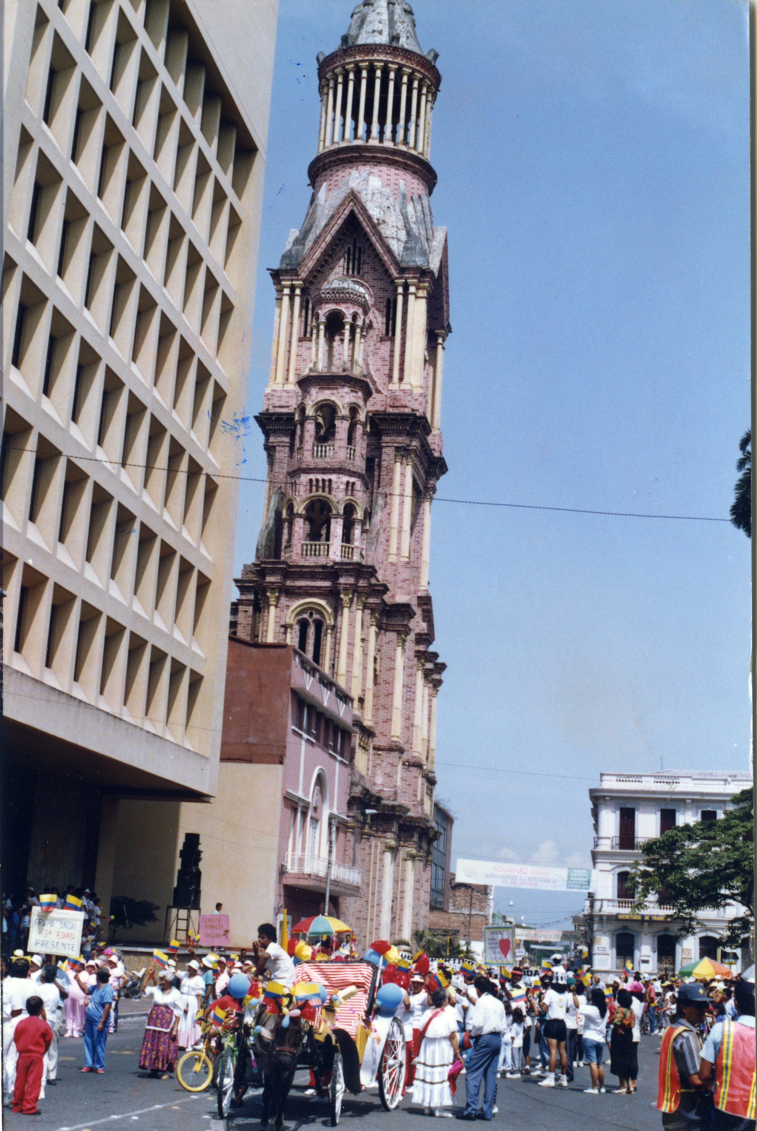 Carrozas y desfile público de grupo de la tercera edad con pancartas, globos y carteles por calle principal de Palmira; a un costado parque central y al otro lado la Catedral Nuestra Señora del Rosario del Palmar.