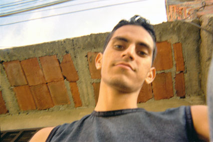 Primer plano. Toma en contra picado de un hombre joven mirando hacia la cámara. Al fondo un muro de ladrillo a la vista.