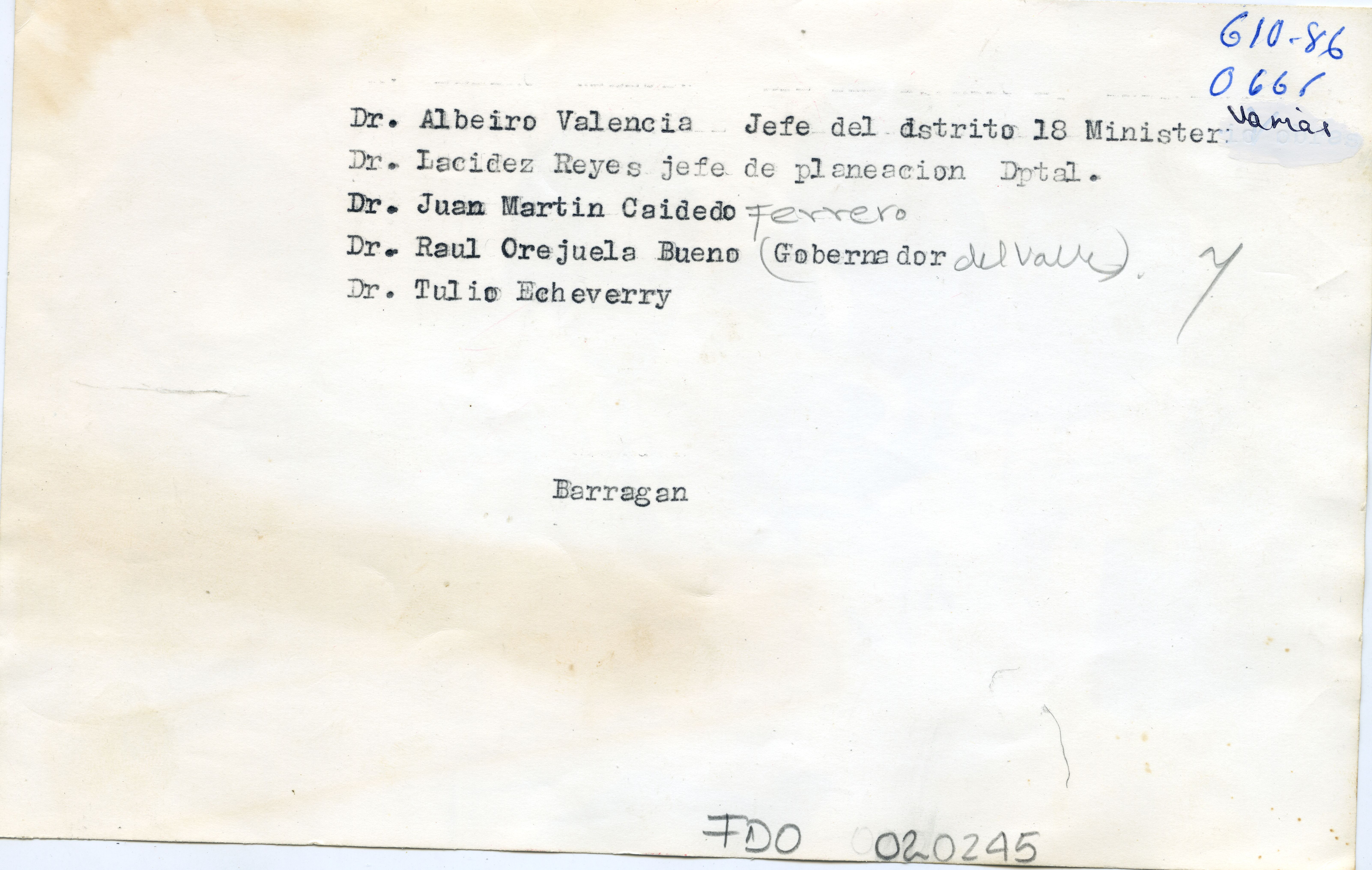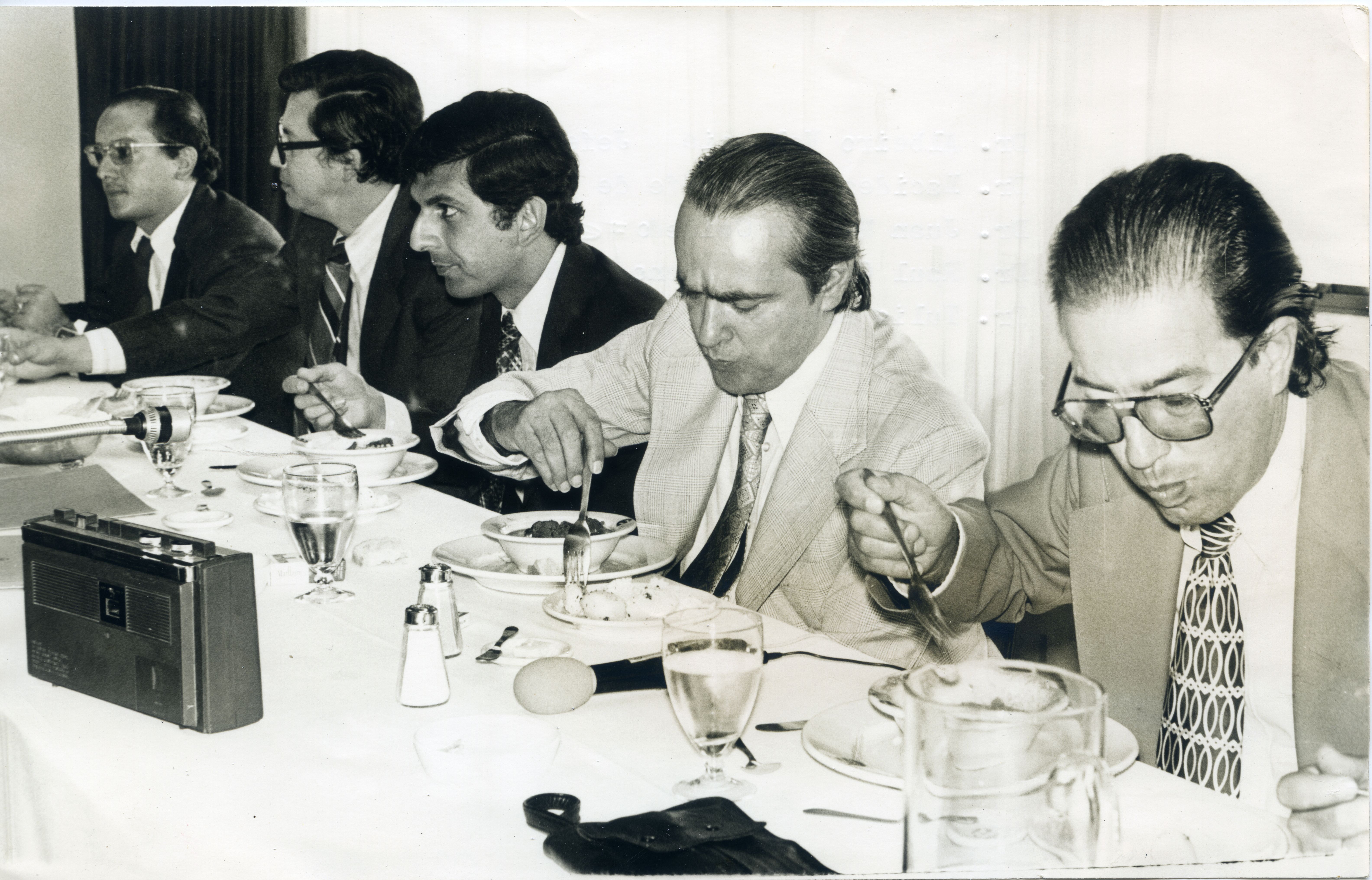 dc.description.abstract | Fotografia de plano medio largo de varias personasa limentandocen, donde se observan personalidades politicos sentados al rededor de una mesa. Al reverso de la fotografía se anexa recorte: " Doctor Albeiro Valencia, jefe del distrito 18 ministerio, Doctor, Lacidez Reyes, jefe de planeación departamental, doctor, Juan Martin Caicedo Ferrero, Doctor Raúl Orejuela Bueno, Gobernador del Valle y doctor Tulio Echeverry." | spa |
