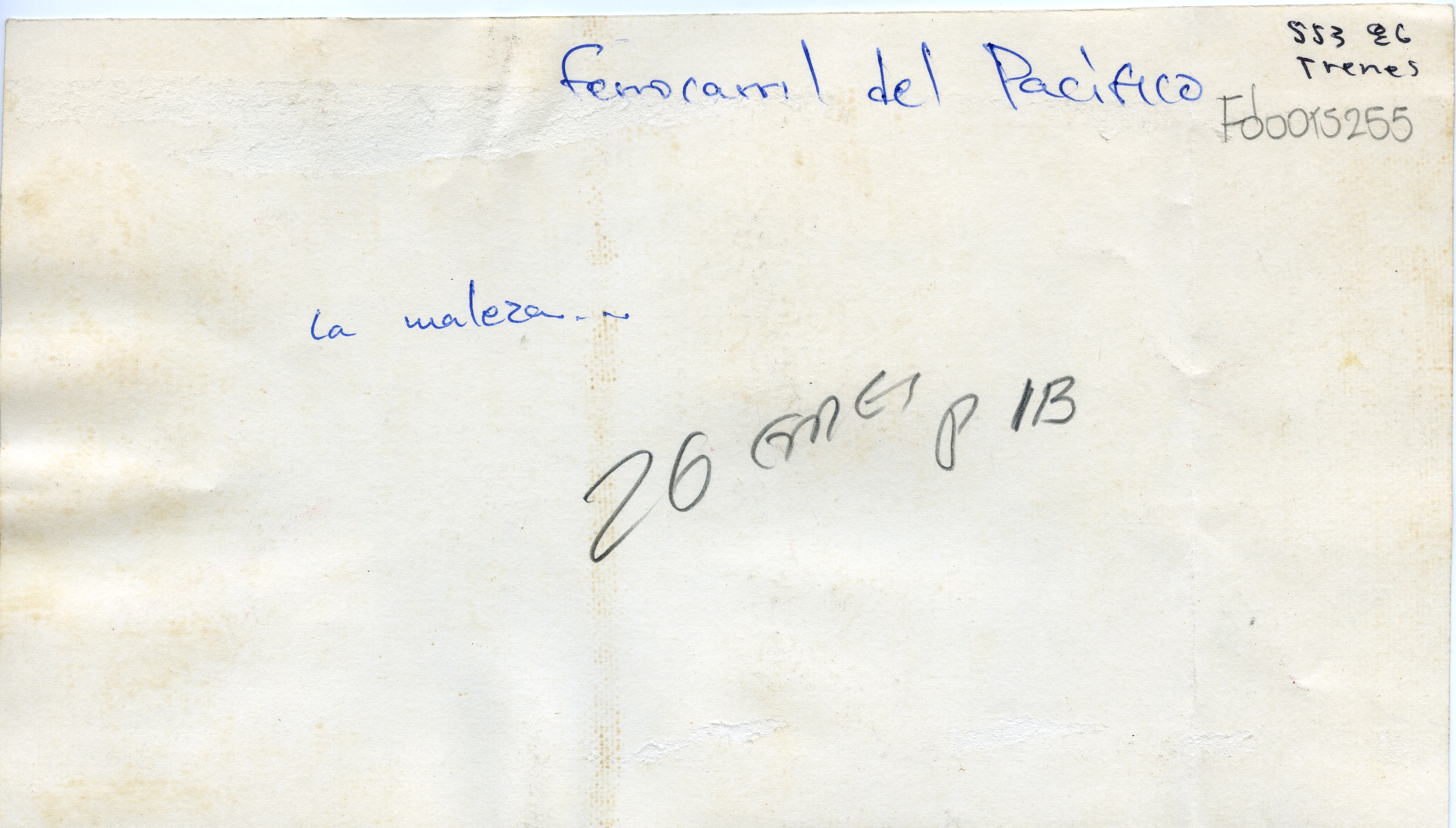 Abandono y olvido del ferrocarril. La fotografía dice al reverso: "Ferrocarril del Pacifico, la maleza".