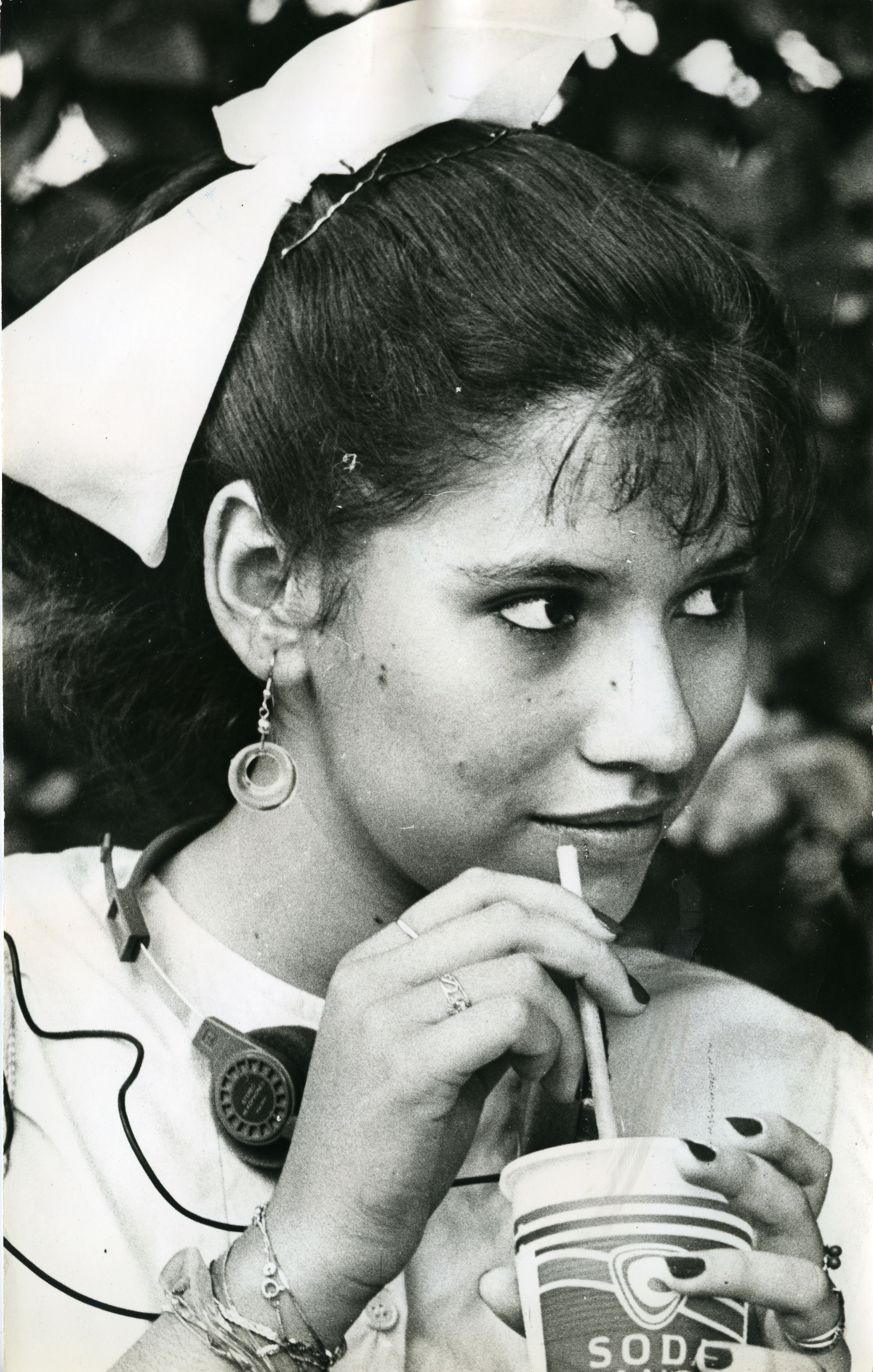 Ángela Sardi, aficionada toros, tomando bebida gaseosa
