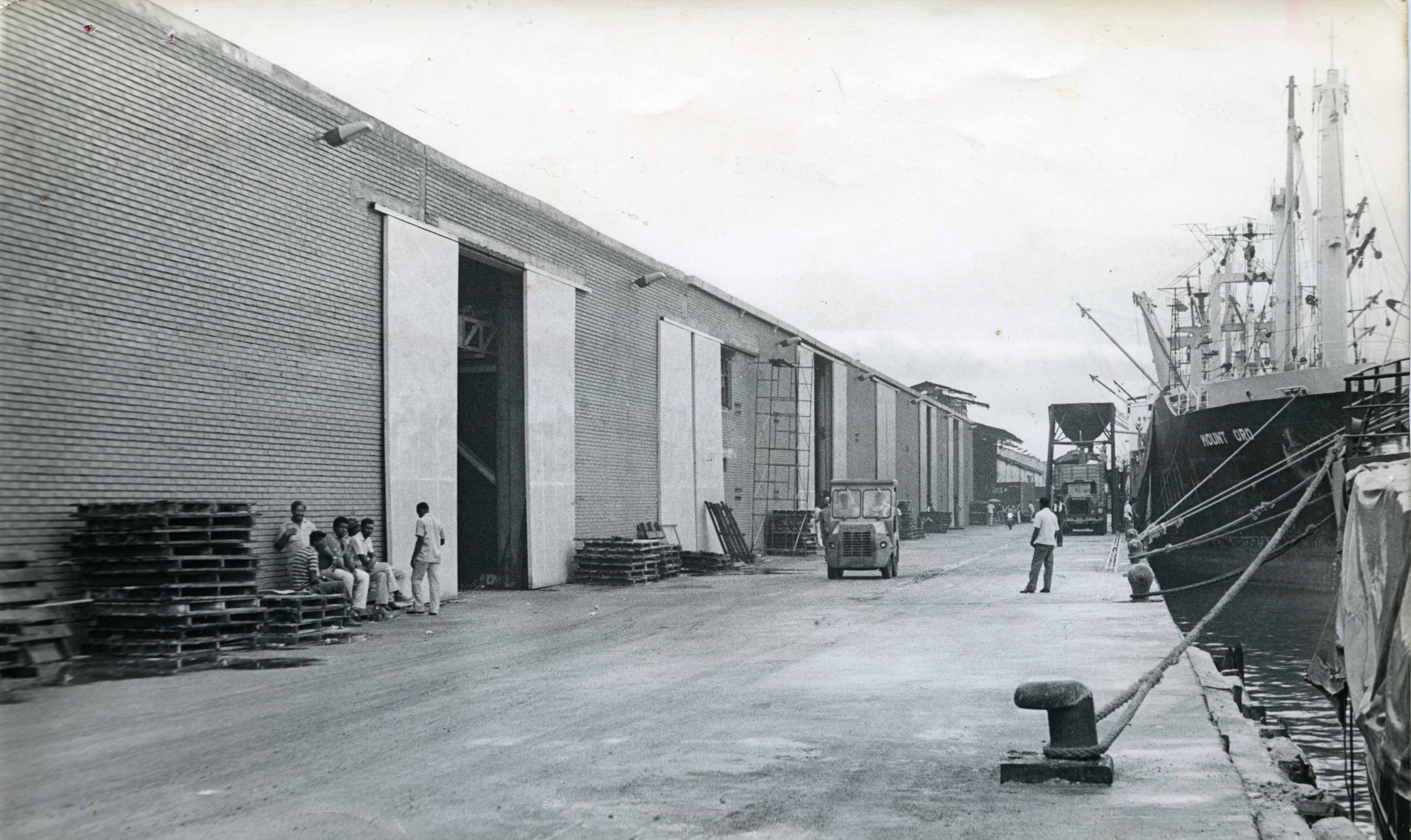 Vista frontal de las bodegas del muelle azucarero en Buenaventura