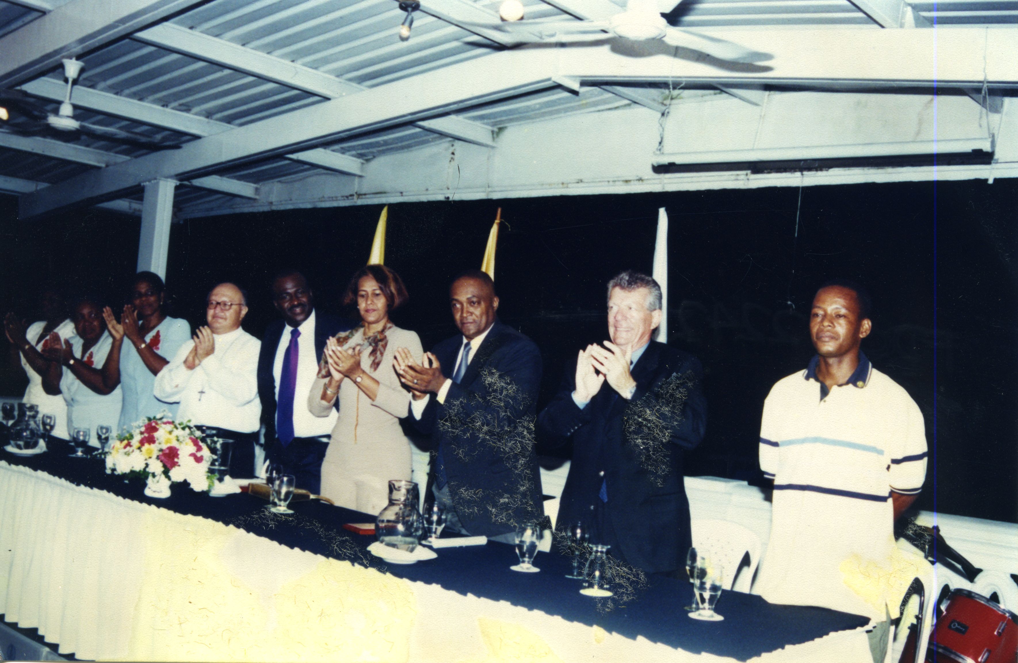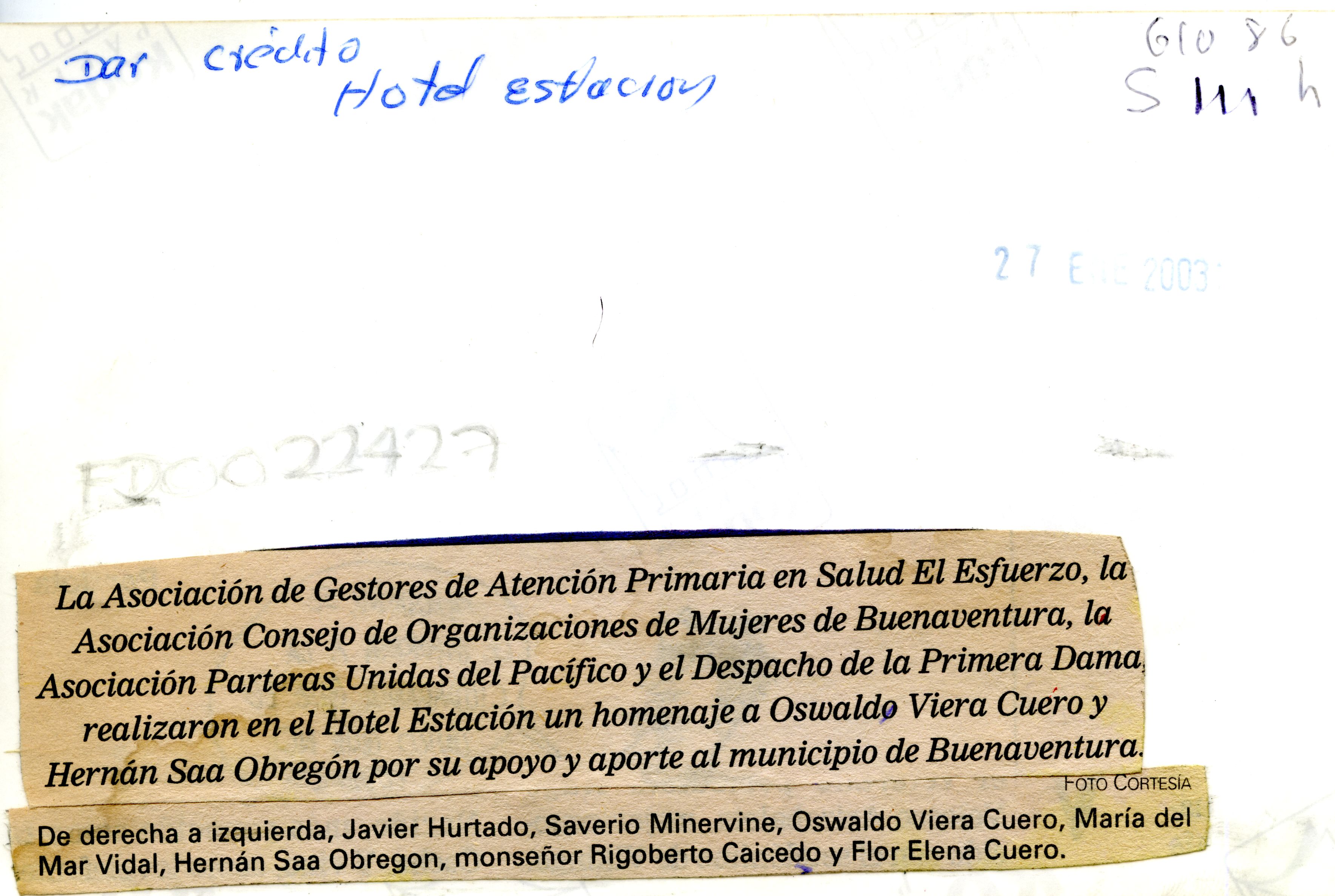 Reverso: La Asociación de Gestores de atención Primaria en salud El Esfuerzo, La Asociación Consejo de Organizaciones de Mujeres de Buenaventura, La Asociación Parteras Unidas del Pacífico y el despacho de la primera dama realizaron en el Hotel Estación un homenaje a Oswaldo Viera Cuero y Hernán Saa Obregón por su aporte y apoyo al municipio de Buenaventura. De derecha a izquierda, Javier Hurtado, Saverino Minervine, Oswaldo Viera Cuero, María del Pilar Caval, Hernán Saa Obregón, monseñor Rigoberto Caicedo y Flor Helena Cuero