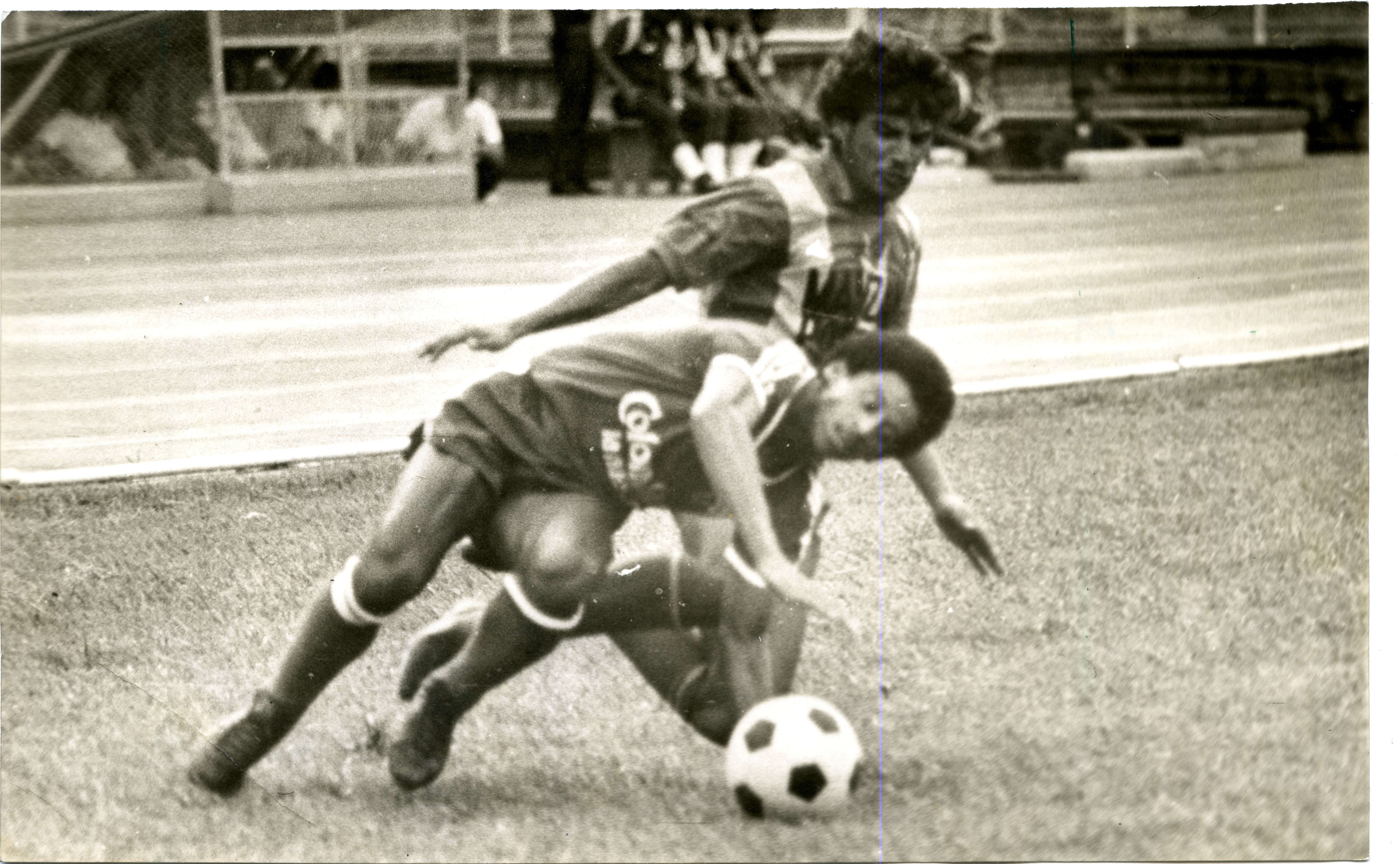 Partido de fútbol entre America de Cali vs Pereira. Se aprecia al jugador de Ávila disputando el balón
