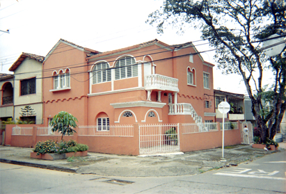 Plano medio. En la imagen se destaca una vivienda de dos plantas, con muros pintados de color naranja y algunos elementos de color blanco. Al extremo derecho un árbol.