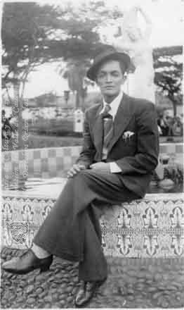 Zósimo Burbano Hoyos, fotografiado al borde de la fuente luminosa del parque de Santa Rosa. Cali. 1939.