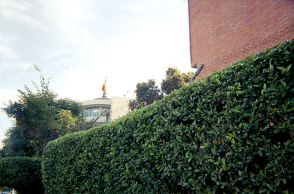 Plano medio. Exterior día. Franja vegetal con formación trapezoide en primer plano. Sobresale cúpula en centro izquierdo con bandera nacional. Textura en relieve terracota en superior derecho.