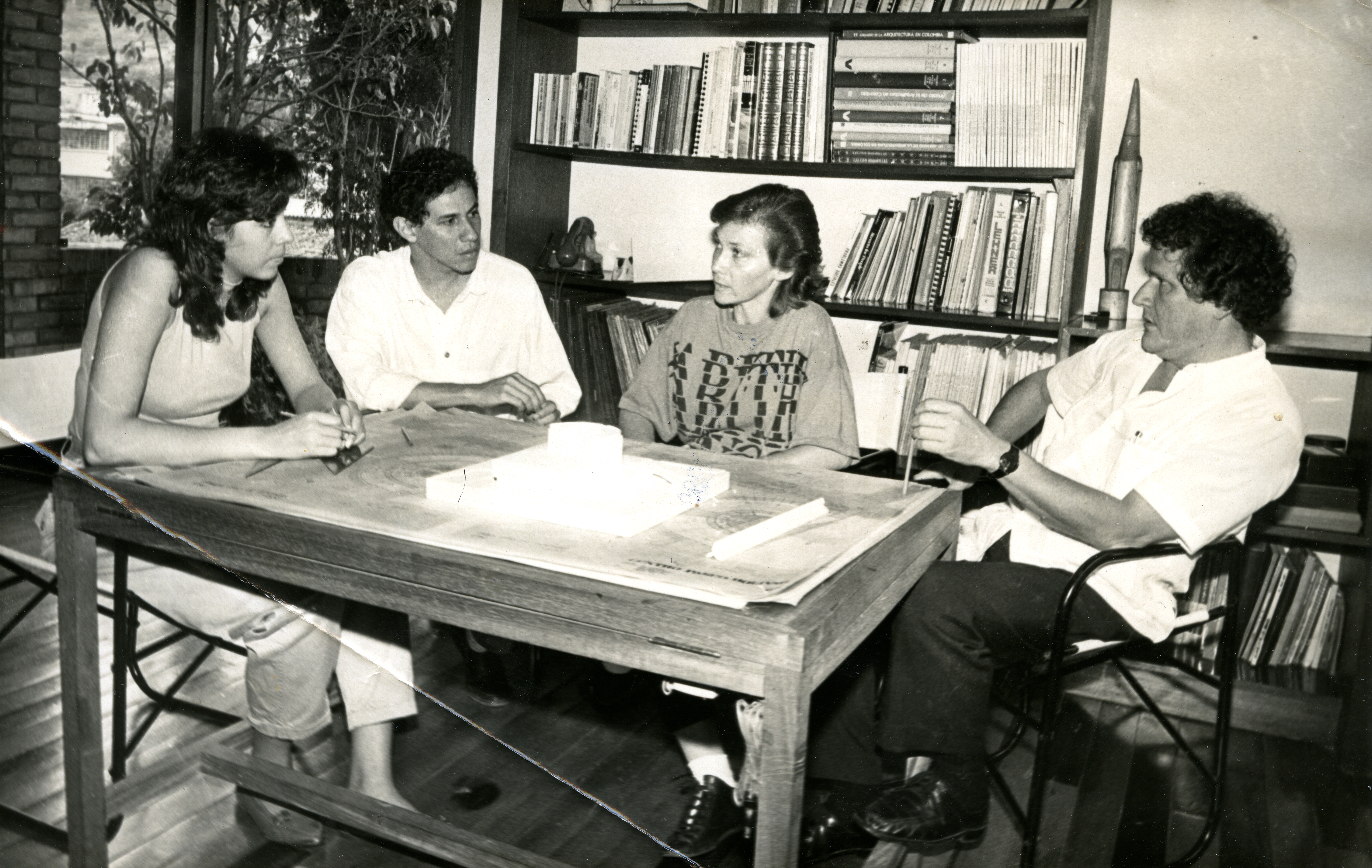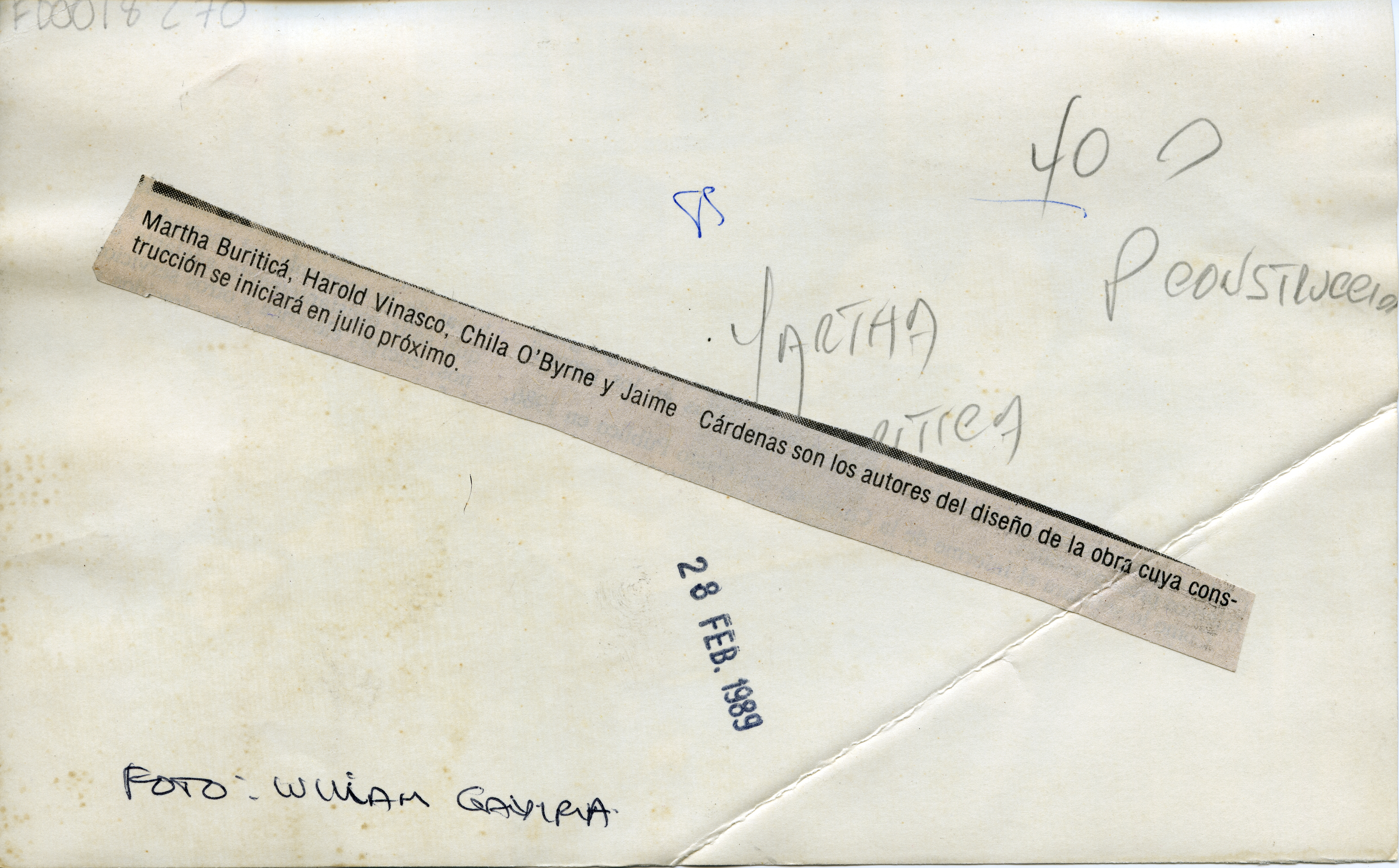 Al reverso de la fotografía se anexa recorte. "Martha Buriticá, Harold Vinasco, Chila O´Byrne y Jaime Cárdenas son los autores del diseño de la obra cuya construcción se iniciará en julio próximo"