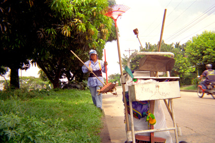 Plano Medio. Imagen tomada en exterior. Se destaca una diagonal generada por un una vía pavimentada y pasamanos de color amarillo en el extremo derecho inferior. Al fondo en el centro de la imagen un hombre con una carretilla transita por la vía transportando guacales en madera. Se observan algunas viviendas al fondo.