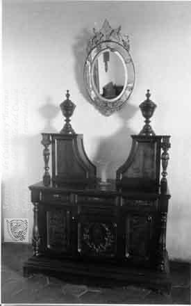 Tocador tallado en madera y espejo en cristal de murano, reliquias históricas de la Hacienda El Paraiso. El Cerrito. 1995