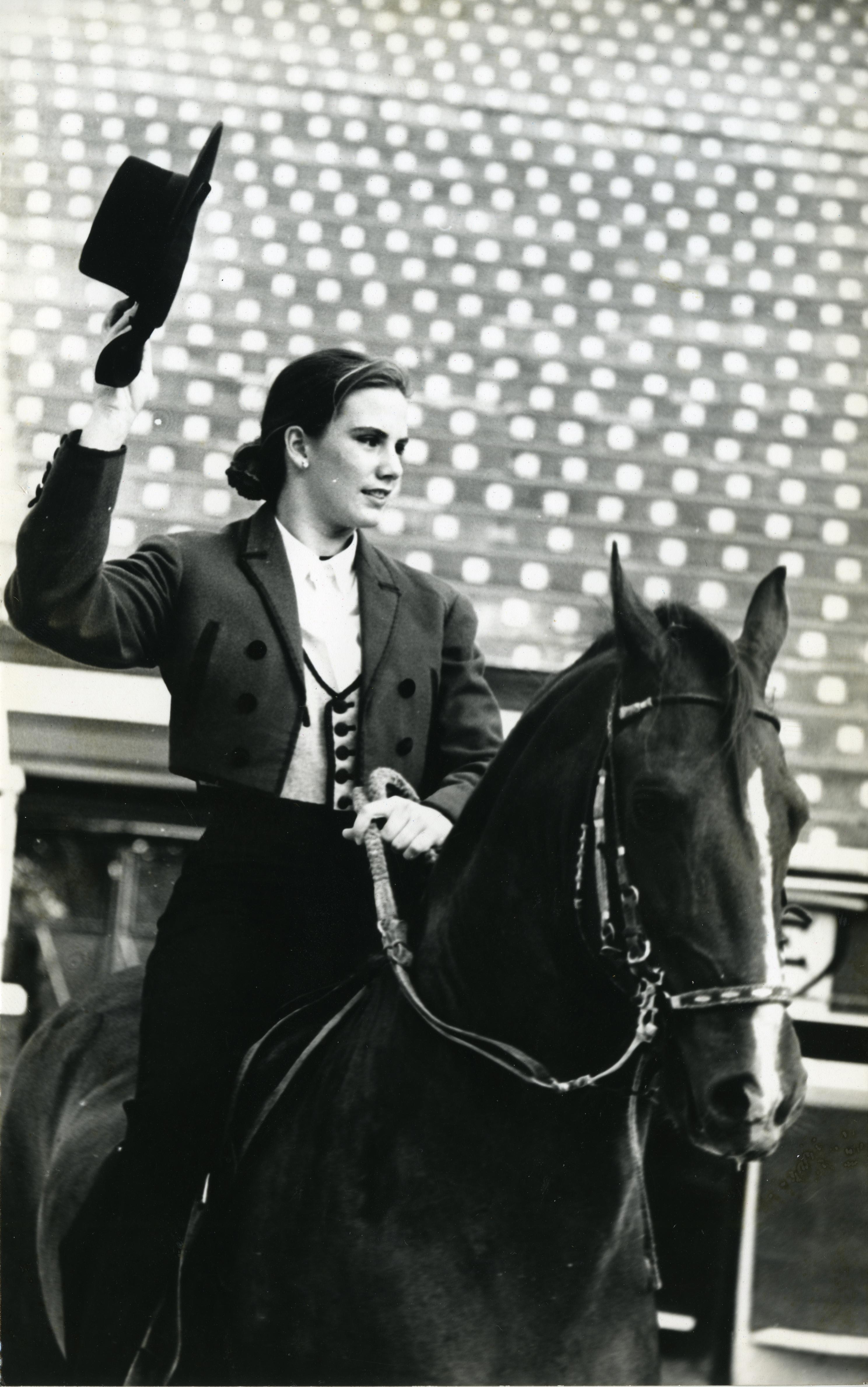 En la gráfica se observa una mujer vestida con traje de equitación y montada sobre un caballo.
