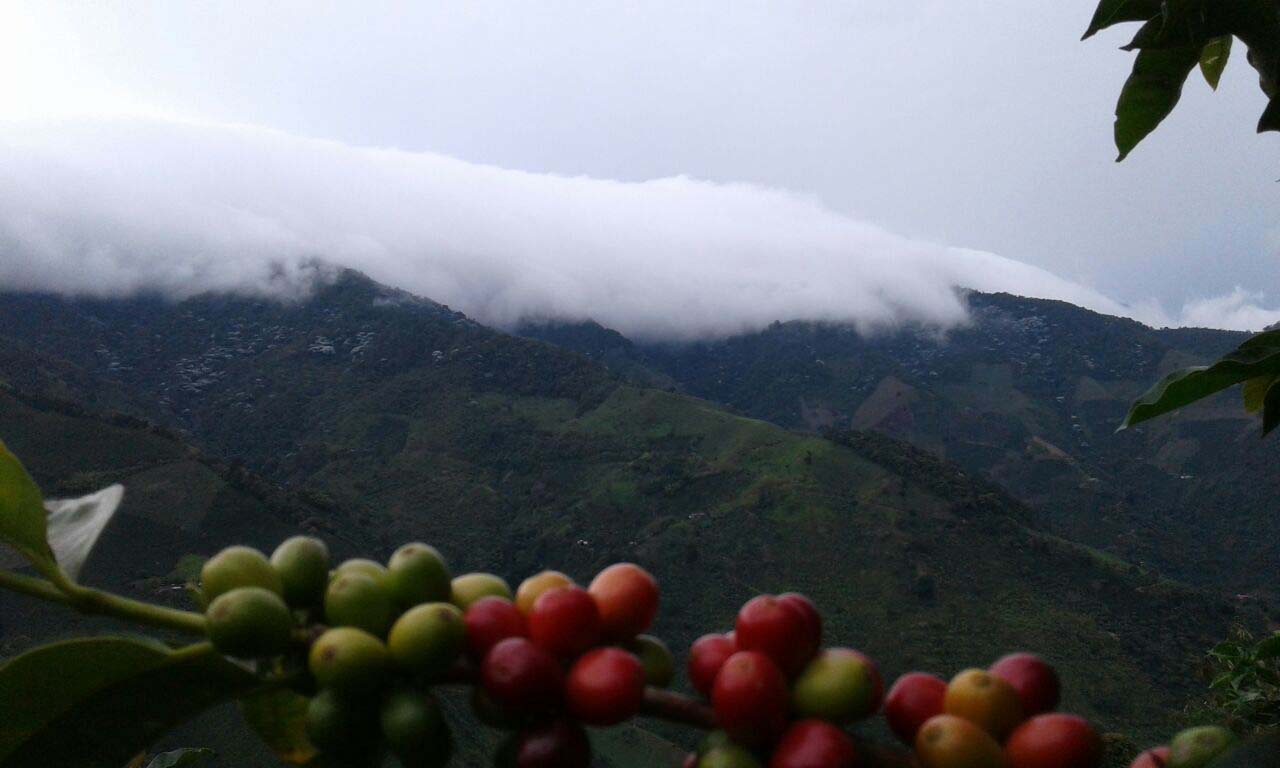 El Águila, Valle del Cauca. Fundado en 1899, por Emelecio Duque, Marcelino Echeverri y los hermanos Bernardo y Natalio Serna. Municipio desde 1953. Economía importante en agricultura, caficultura, ganadería, minería, explotación forestal, etc. Observamos en la imagen, planta con granos de café y hermosa vista de la montaña