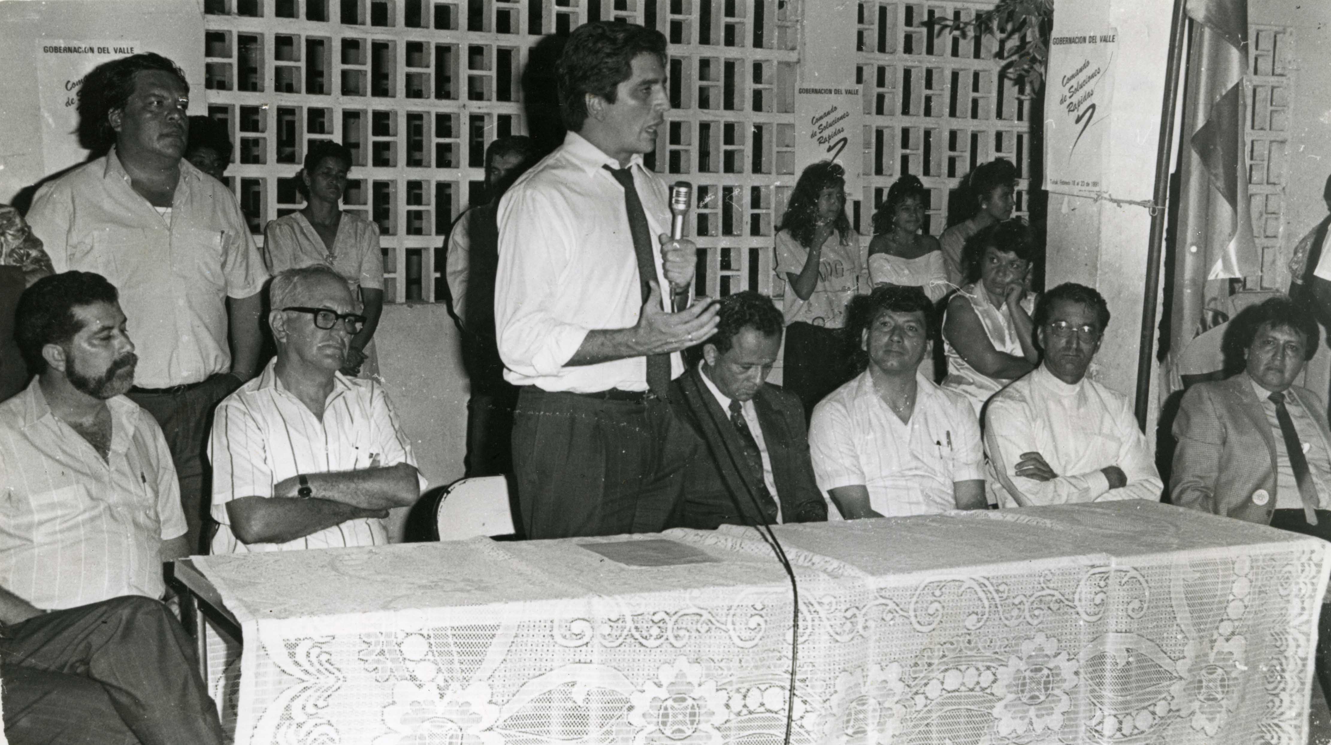 Visita al puesto de salud y guarderia del corregimiento de Aguaclara por parte de Mauricio Guzmán, Gobernador del Valle del Cauca, Carlos Potes, Alcalde de Tuluá e Ignacio Corrales, Padre, entre otros----El Archivo del Patrimonio Fotográfico y Fílmico del Valle del Cauca es responsabilidad de la Biblioteca Departamental del Valle Jorge Garcés Borrero, por convenio de cooperación suscrito con la Secretaria del Cultura Departamental, con el fin de aunar esfuerzos para su conservación, preservación y divulgación del Archivo entre la comunidad Vallecaucana, especialmente entre los estudiantes e investigadores que visitan la Biblioteca, propiciando el su uso y consulta permanente. La universidad Icesi es un colaborador en el proceso de difusión, facilitando la tecnología que permite la consulta de las imágenes.