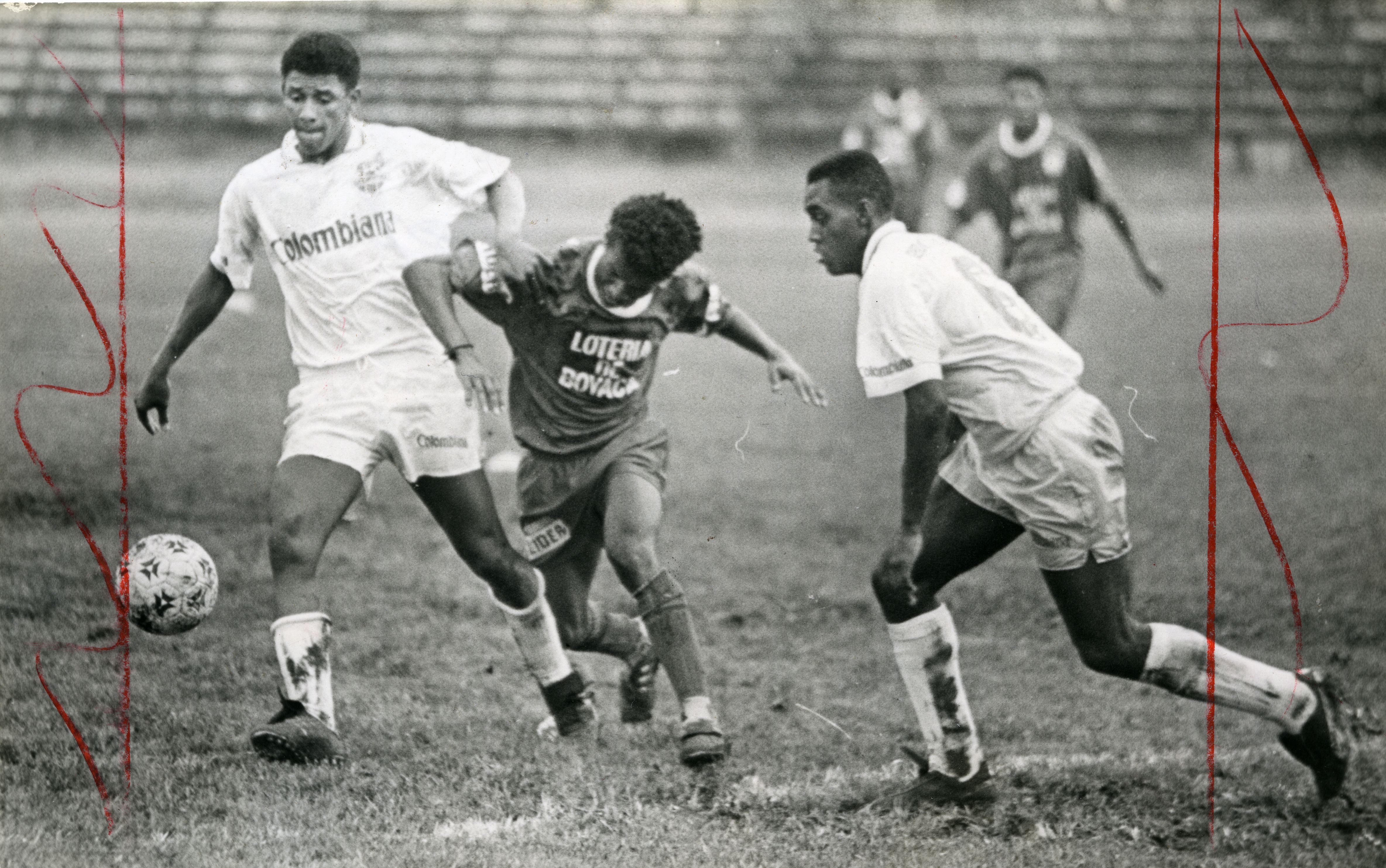 En la gráfica partido de fútbol entre los equipos Lanceros de Boyacá y Buenaventura de la primera B. Se aprecia jugadores en disputa del balón