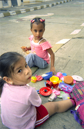 Primer plano. Dos niñas sentadas en andén de calle. Las dos miran a cámara. en el medio juguetes. Exterior día.