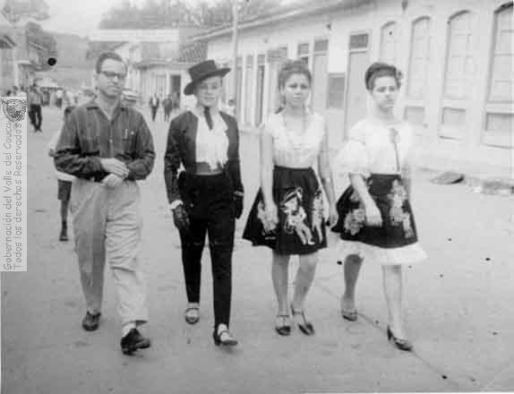 Fernando Henao, Américo Mejía, Elsy Botero, Gladys Saavedra. Lucen atuendos propios para una celebración por identificar. Caicedonia. 1968.