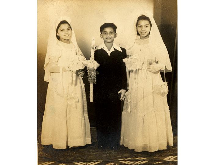 Marina Meza, jesús A. Hernández y Graciela Meza, el día de su primera comunión. Santiago de Cali, 1947.