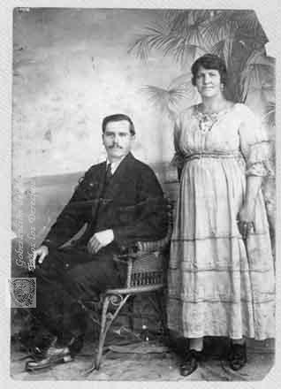 Los esposos don Pablo Emilio Sierra Baena y doña María Jesús Montaño. Fotografía de estudio con panorámica paisajísticas en el telón de fondo. Es común, en estas fotos de estudio de principios de siglo XX, encontrar al hombre sentado mientras que la mujer posa de pie. Cali. C. 1920.
