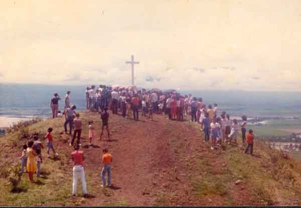 Comunidad alrededor de la Santa Cruz en una ceremonia religiosa por identificar. Yotoco, 1978