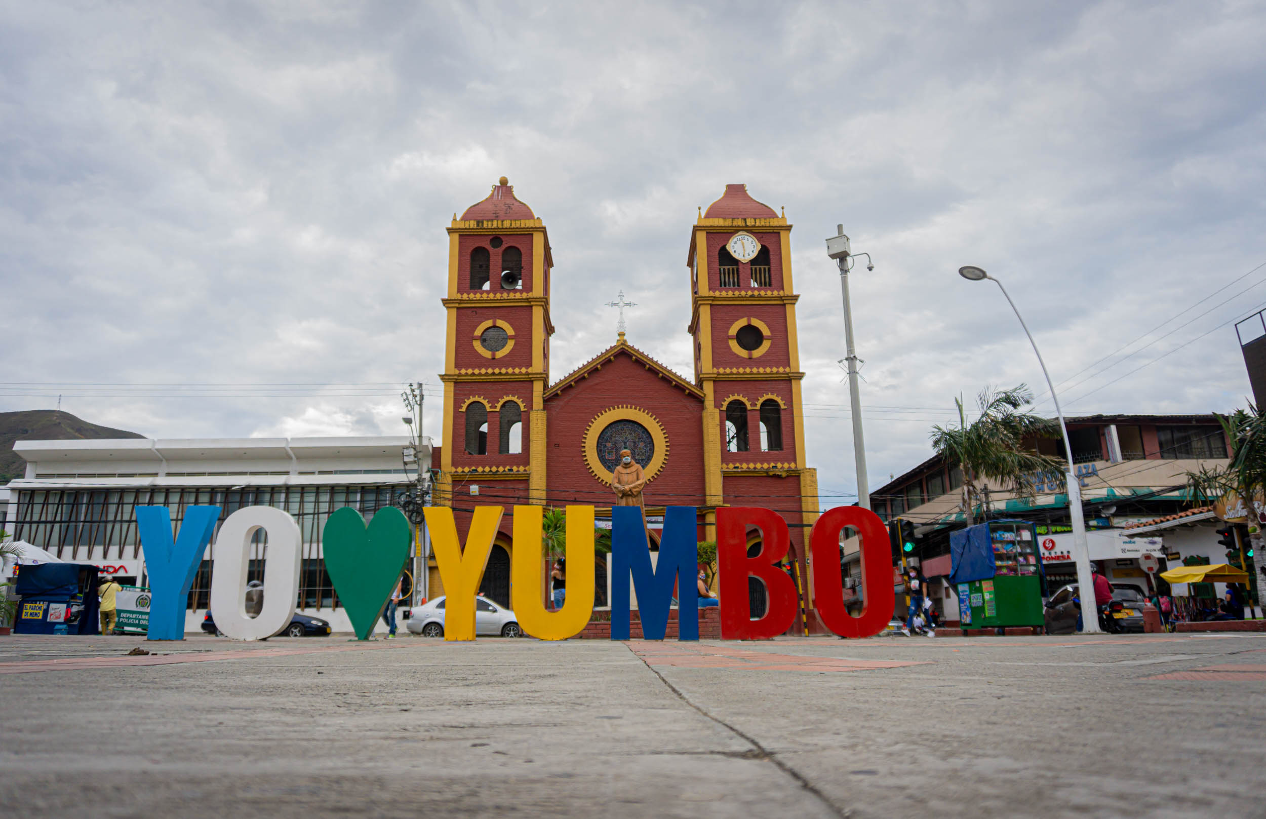 Se aprecia la iglesia del Santuario señor del buen consuelo, en la plazoleta se evidencia aviso con la siguiente información "Yo amo a Yumbo"