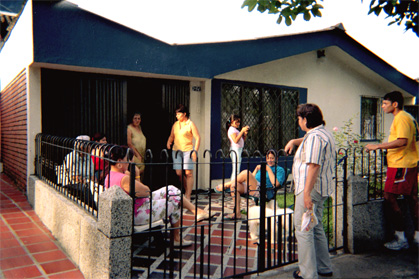 Plano medio. Familia reunida en antejardín de residencia. Sobresale composición en Zigzag de fachada. Exterior día.