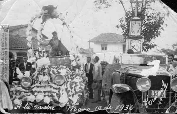 Homenaje a las Madres representado en dos carrozas, la de la derecha a la madre muerta, la de la izquierda a la madre viva. Caicedonia, Mayo 17 de 1936.