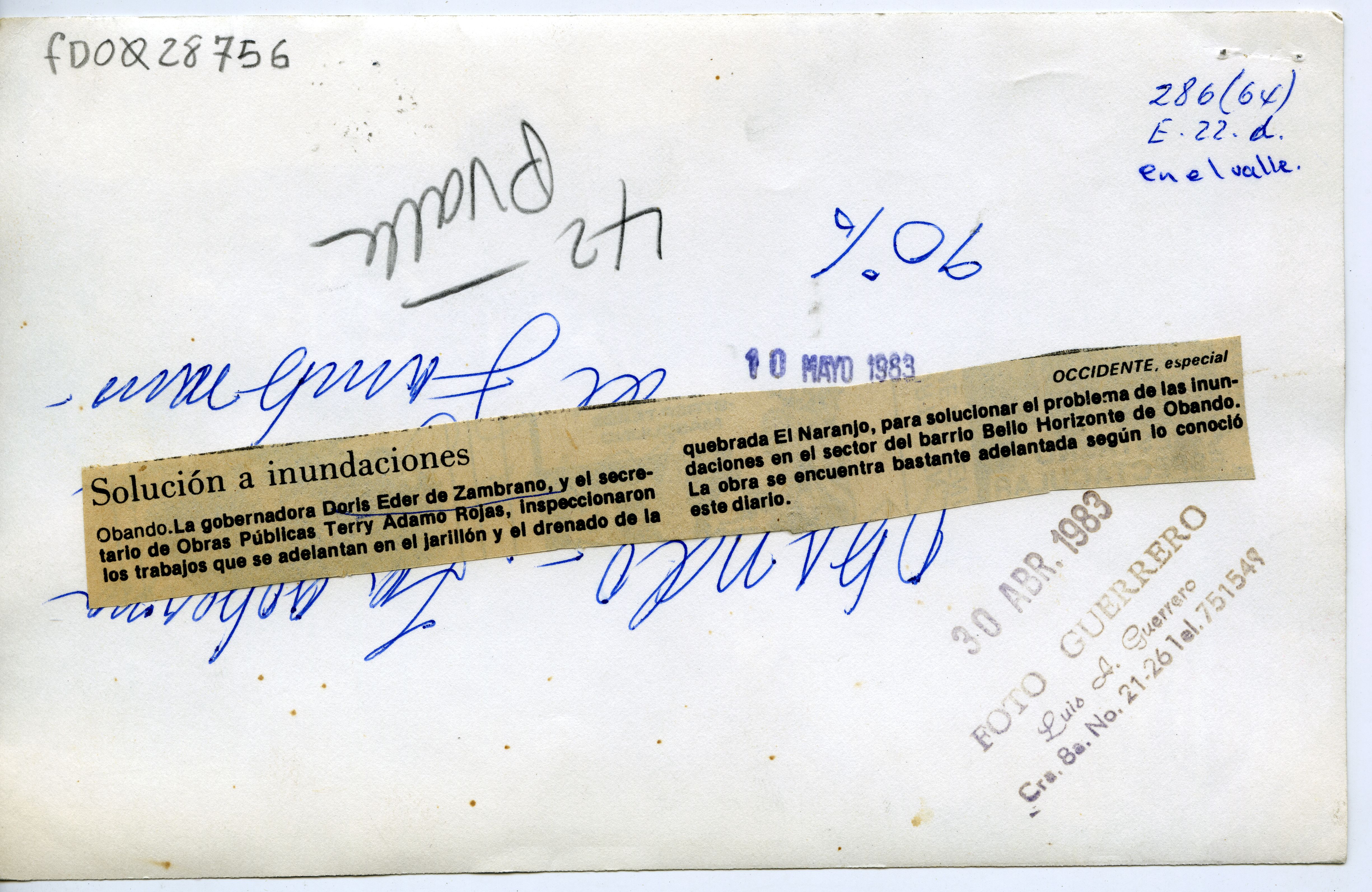 "Reverso: Solución a inundaciones. Obando. la gobernadora Doris Eder de Zambrano, y el secretario de Obras Públicas Terry Adamo Rojas, Inspeccionaron los trabajos que se adelantan en el jarillón y el drenado de la quebrada El Naranjo, para solucionar el problema de la inundaciones en el sector del barrio Bello Horizonte de Obando. La obra se encuentra bastante adelantada según lo conoció este diario."