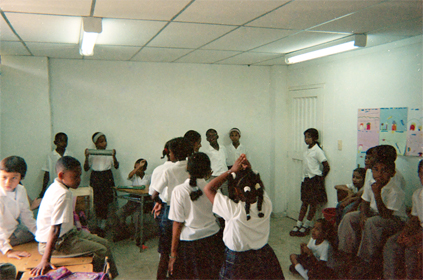Alumnos en medio de una actividad recreativa en el interior de un salón de clases