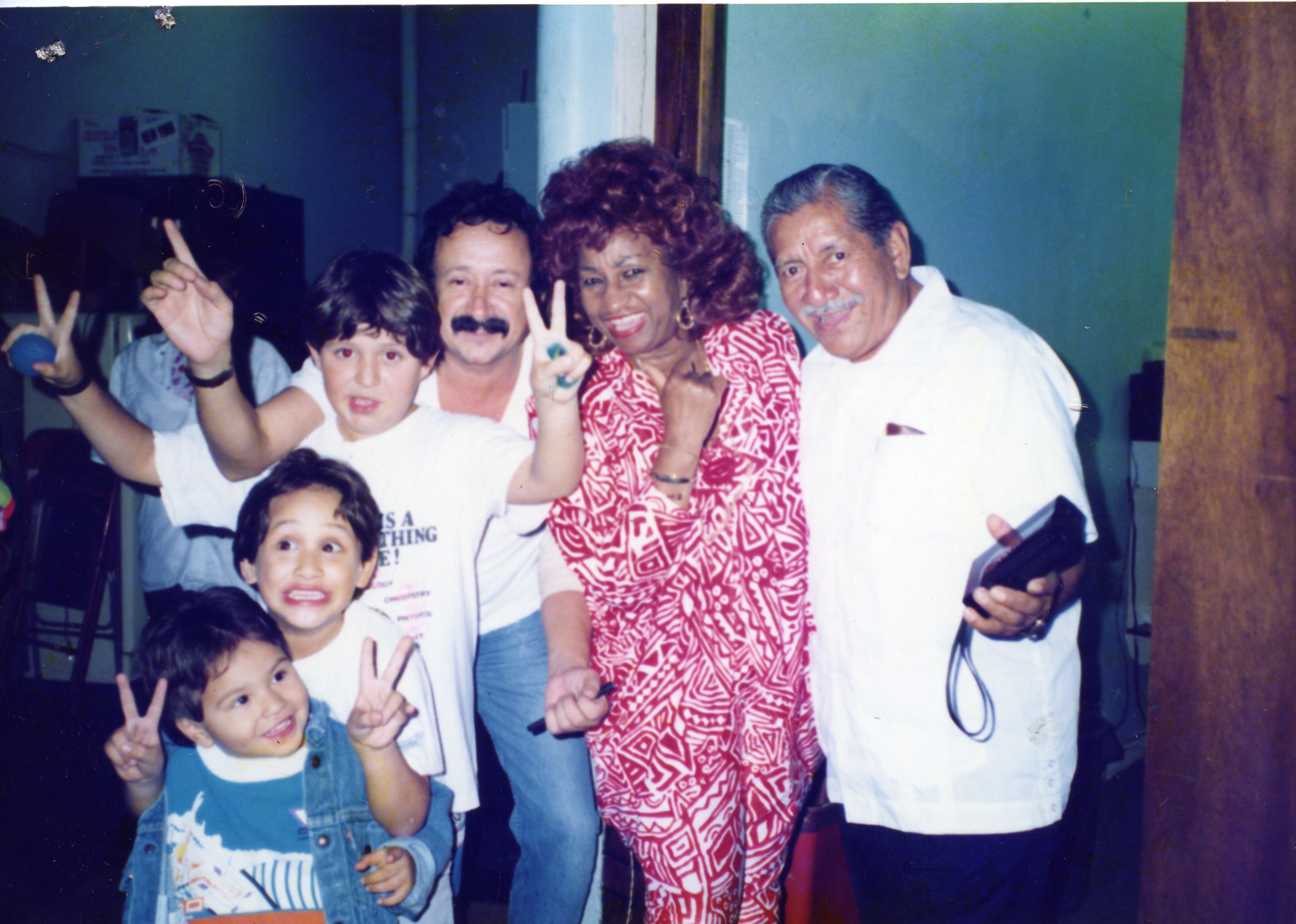 Celia Cruz posando para la foto en compañia de: De izquierda a derecha: Humberto Corredor, caleño, propietario del sello "Caimán Records", la reina de la salsa Celia Cruz y el promotor de espectáculos Miguel Proaño