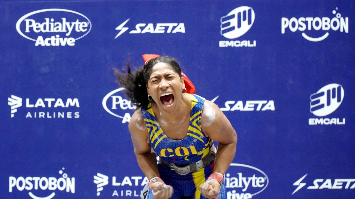 En la fotografía podemos observar a la deportista Julieth Alejandra Rodríguez Quintero, quien se encuentra participando en la modalidad levantamiento de pesas-femenino en los " I Juegos Panamericanos Junior",llevados a cabo en la ciudad de Cali. Ella lanza un grito de orgullo por lo que ha logrado.