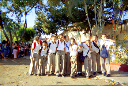 Infantes en el exterior de la escuela Zusana Vinazco posando para la toma
