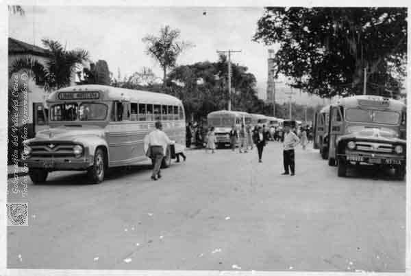 Los buses, característicos de los años 50's, apostados en la calle de la Basílica de Buga
