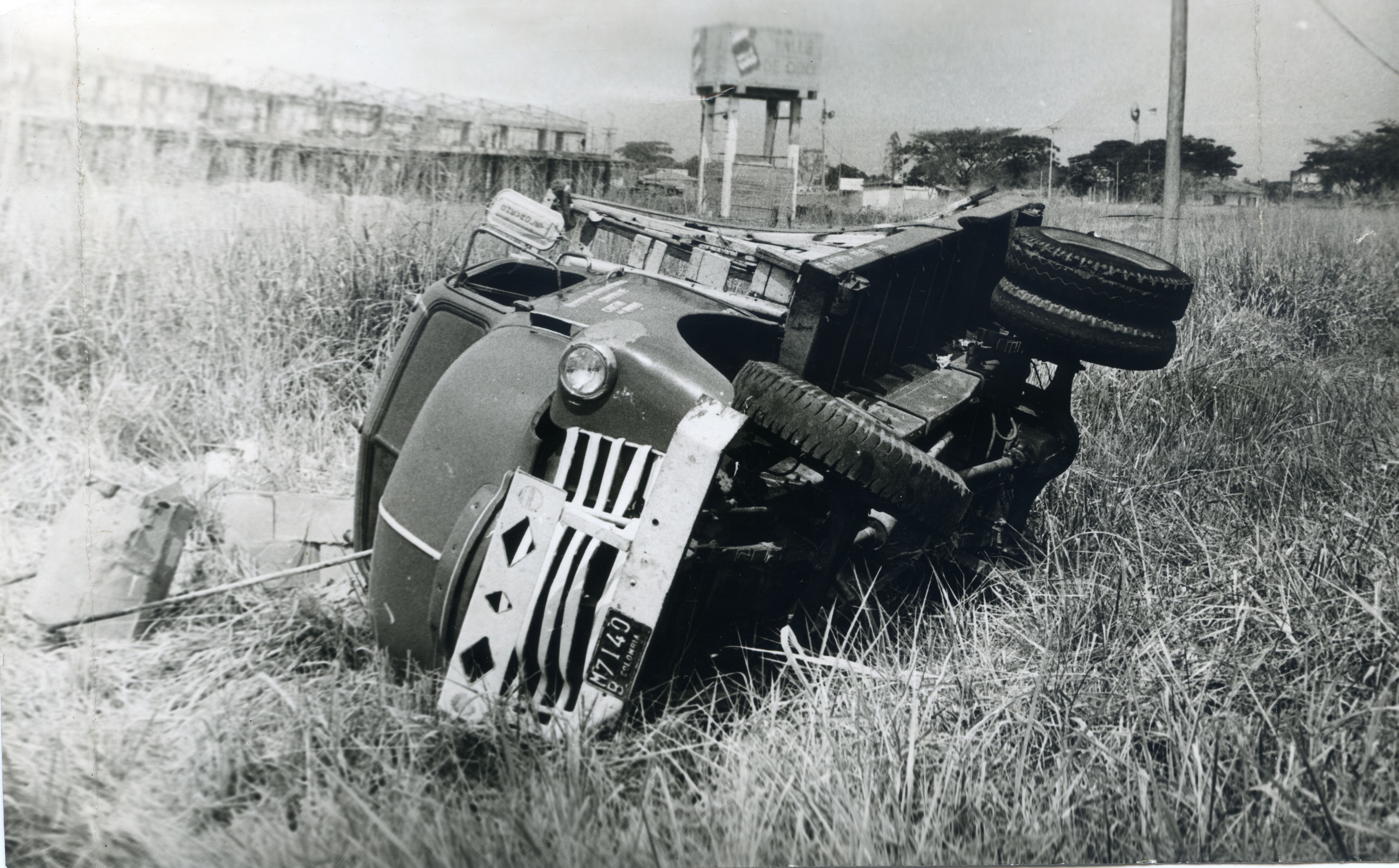 En el registro fotográfico podemos observar un camión volcado. Este accidente de tránsito tuvo lugar en Candelaria y al parecer fue causado por fallas mecánicas, las cuales hicieron que el vehículo se saliera de la vía. Al reverso de la fotografía se anexa recorte: "No hubo heridos. Fallas mecánicas hicieron salir de la vía a este camión, a la altura de Candelaria. El conductor, de quien se desconoce la identidad, salió ileso. El camión transportaba mercancía, la cual resultó averiada."