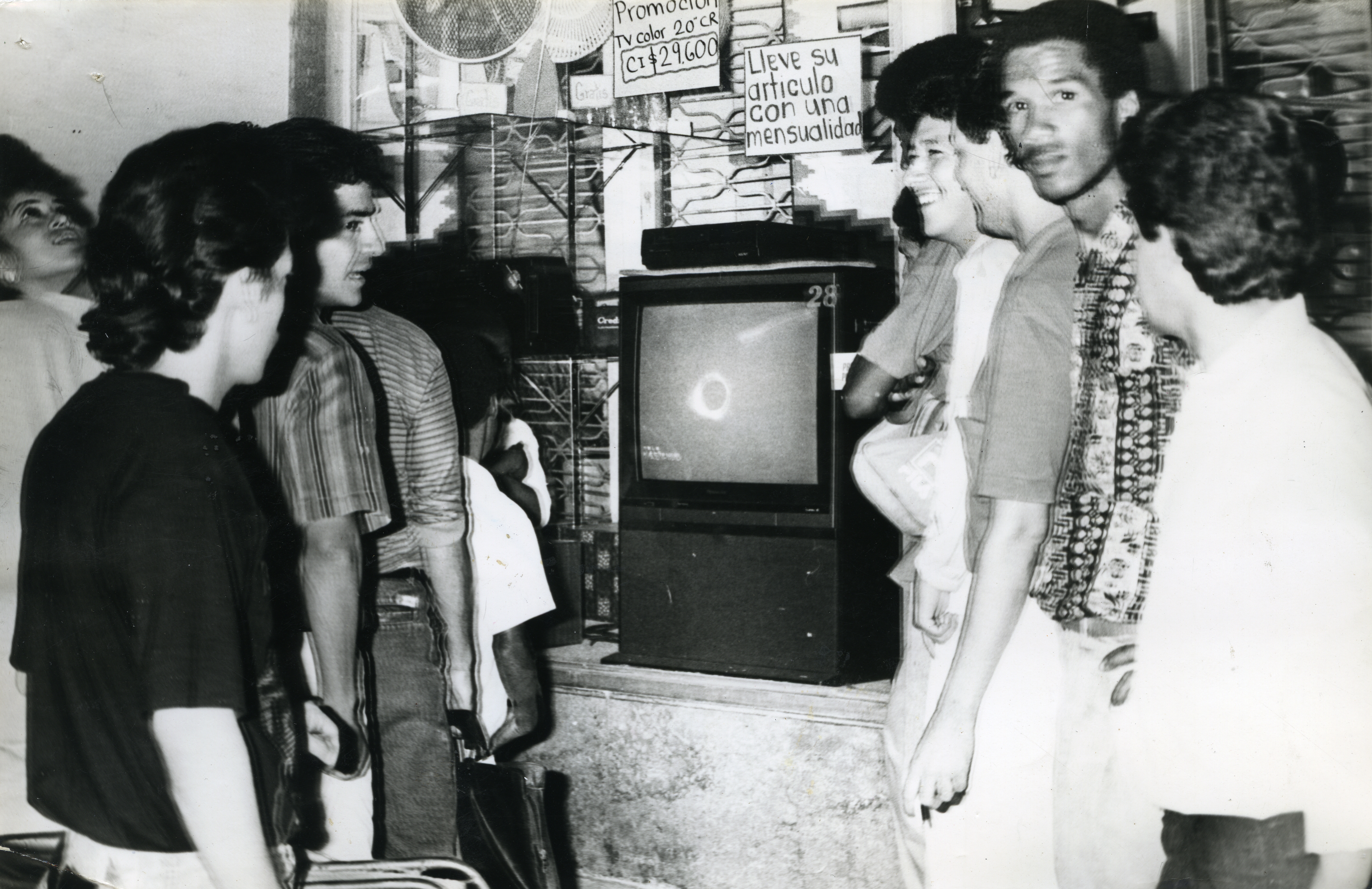 Al reverso de la fotografía dice: Curiosos se agolpan frente a un aparato de televisión instalado en uno de los pocos comercios que permanecieron abiertos ayer en la tarde para apreciar el eclipse total de sol. El ausentismo laboral fue notorio y la mayoría de las empresas públicas y privadas dieron la tarde libres a sus empleados. Tan solo los más pesimistas, se ubicaron frente a la televisión para observar el fenómeno que nos obsequio la naturaleza el pasado 11 de julio