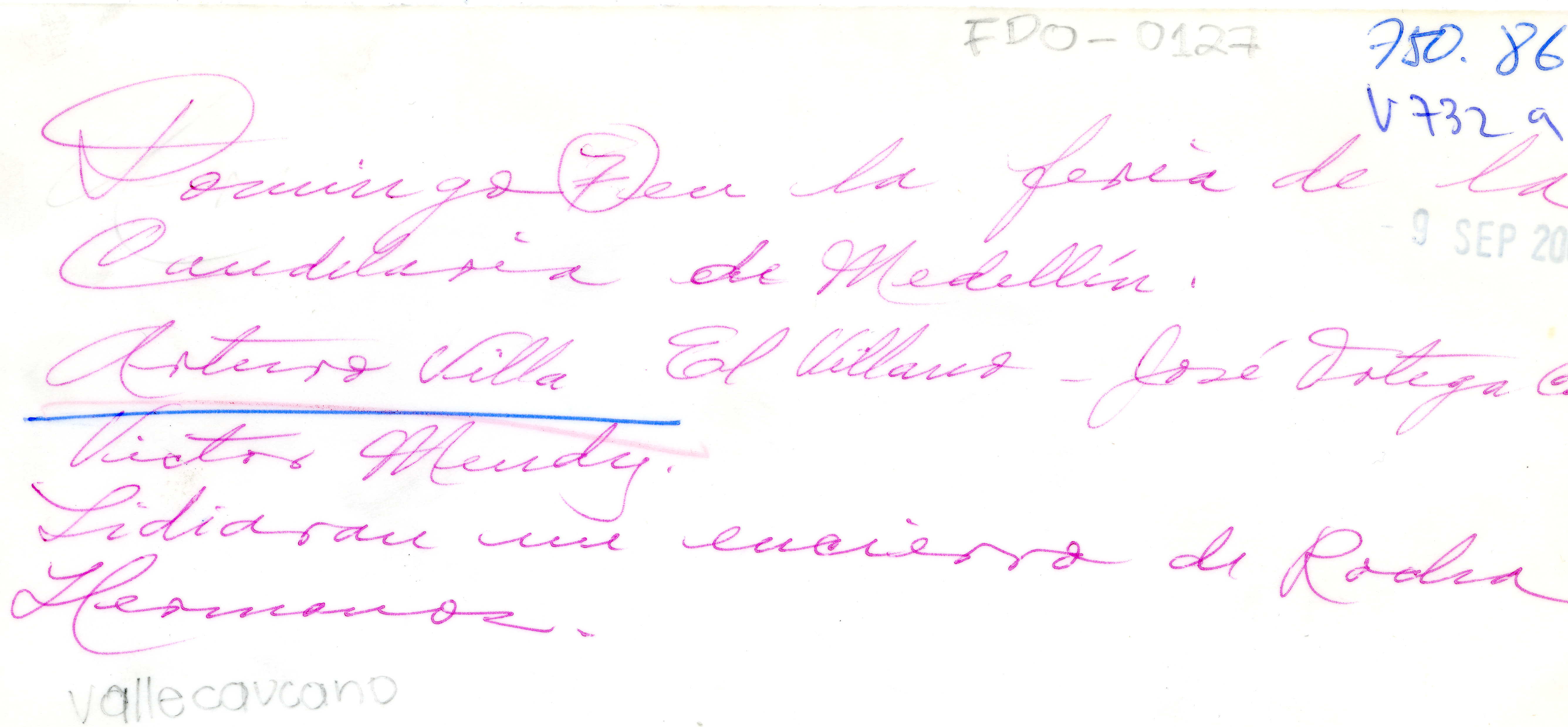 Domingo 7 en la feria de la Candelaria, Aruto Villa "El Villano", José Ortega y Victor Mendy, lidiaron un encirro de rodeo hermanos. El Archivo del Patrimonio Fotográfico y Fílmico del Valle del Cauca es responsabilidad de la Biblioteca Departamental del Valle Jorge Garcés Borrero, por convenio de cooperación suscrito con la Secretaria del Cultura Departamental, con el fin de aunar esfuerzos para su conservación, preservación y divulgación del Archivo entre la comunidad Vallecaucana, especialmente entre los estudiantes e investigadores que visitan la Biblioteca, propiciando el su uso y consulta permanente. La universidad Icesi es un colaborador en el proceso de difusión, facilitando la tecnología que permite la consulta de las imágenes.