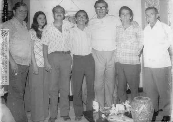 El expresidente de la República Julio César Turbay Ayala, junto a algunos líderes políticos locales como Julian García y Leoncio Libreros, en una reunión política en San Pedro. 1974.