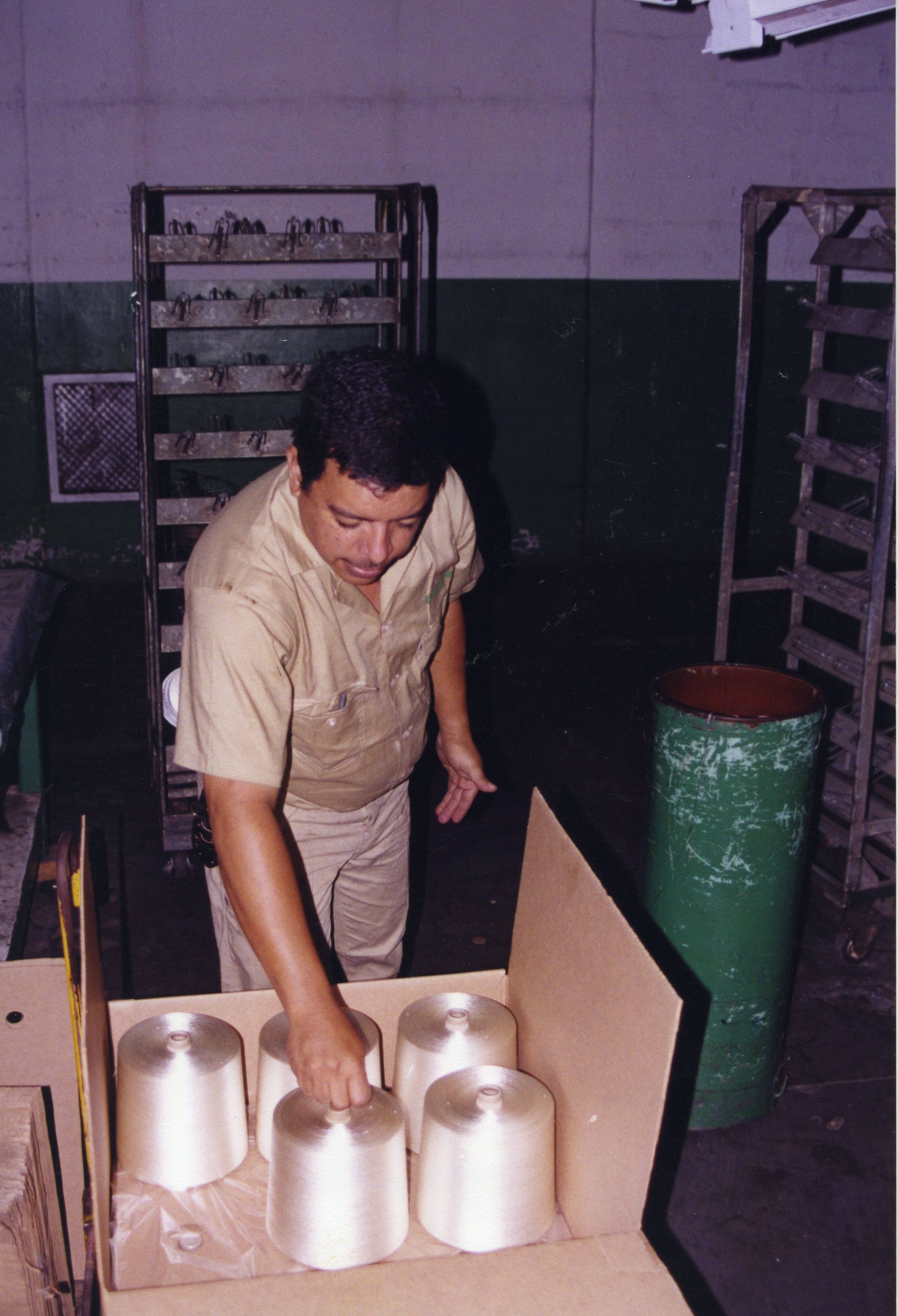 Fotografía de plano medio largo, de una persona que se ve con un uniforme de color café o caqui, al frente de él podemos ver lo su mano derecha estirada tocando lo que parece tubinos de hilo industriales.