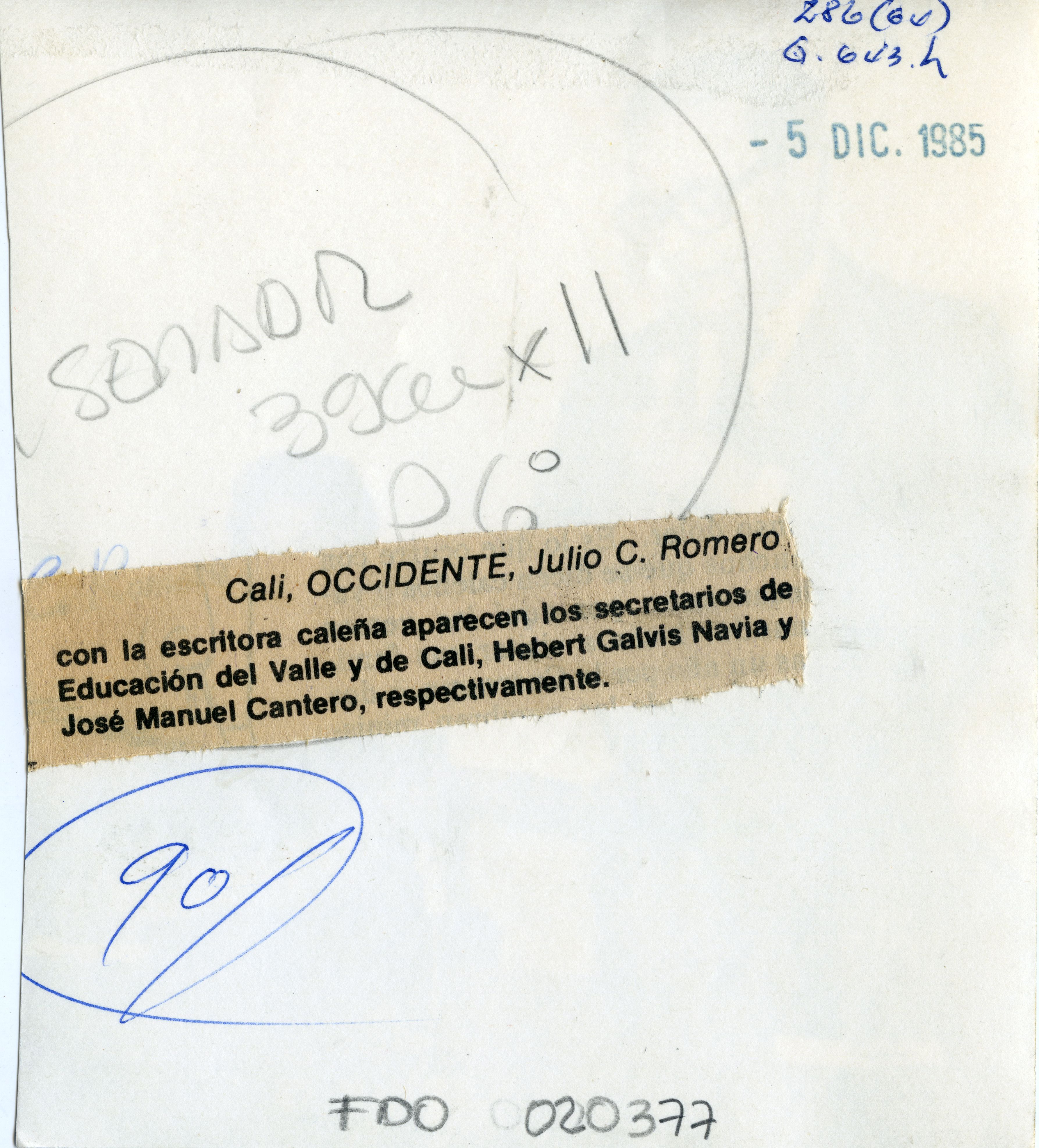 Al reverso de la fotografía se anexa recorte: " Con la escritora Caleña aparecen los secretarios de educación del Valle y de Cali, Hebert Galvis Navia y José Manuel Cantero, respectivamente