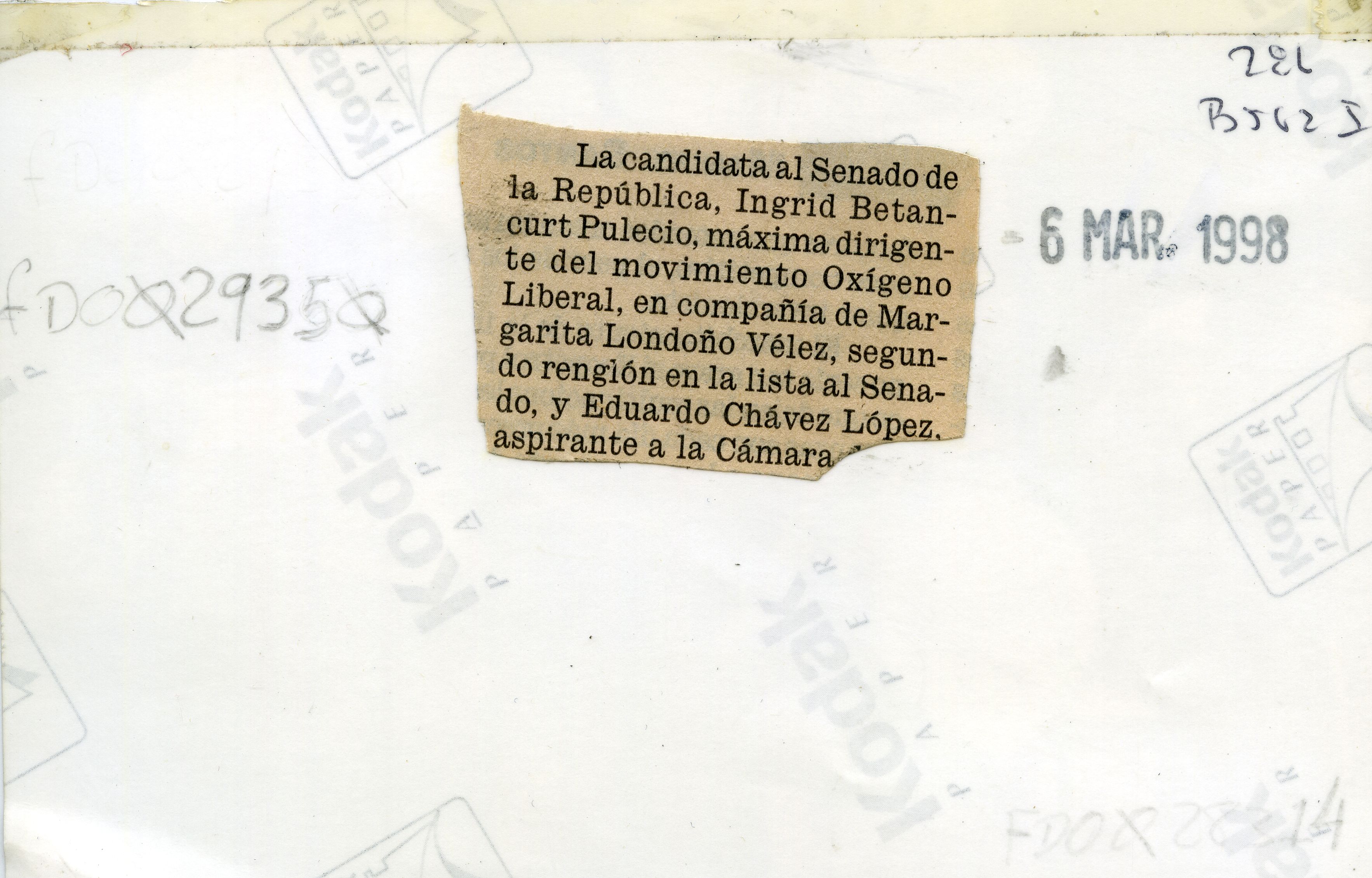 "Íngrid Betancourt Pulecio nació en Bogotá el 25 de diciembre de 1961. Politóloga y Política. Inició su carrera política en la Cámara de Representantes. Fue reconocida por su lucha contra la corrupción política. Apoyó la salida pacífica del conflicto armado de Colombia. Renunció al Partido Liberal tras denunciar la crisis del Proceso 8.000. Se postuló por el Partido verde Oxígeno al Senado en las elecciones legislativas del año 1998, donde fue electa con la primera mayoría nacional. Renunció a su escaño en 2001 para postularse a la presidencia de su país en las elecciones 2002 - 2004. El 23 de febrero de 2002, fue secuestrada cuando se dirigía a la zona de distensión establecida por el regente presidente Andrés Pastrana. Con este acontecimiento, ganaría la solidaridad de muchos seguidores, convirtiéndose en una causa célebre. El 2 de julio de 2008 la Fuerza Pública realizaron una operación de inteligencia militar; resultado de esto, se da su liberación junto con tres contratistas estadounidenses y once miembros del Ejército Nacional que habían permanecido secuestrados, algunos por más de diez años. Después de su liberación, se residencia con su familia a Francia, dedicándose a trabajar por las víctimas del terrorismo. Condecoraciones: Caballero de la Orden Nacional de la Legión de Honor, Premio TV y Novelas México, Honorary citizen of Paris 2002, Petra-Kelly-Preis 2002, Medalla Geuzen 2004, Premio M100 Media 2008, Premio Princesa de Asturias de la Concordia 2008, 100 Mujeres de la BBC 2013. En la foto aparece Ingrid Betancourt en la plazoleta del CAM, comparte con sus compañeros de formula Eduardo Chávez López y Margarita Londoño Vélez."