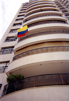 Primer plano de edificio. Contrapicado. Sobresale bandera colombiana ondeante en lado izquierdo. Línea como elemento constante de composición.