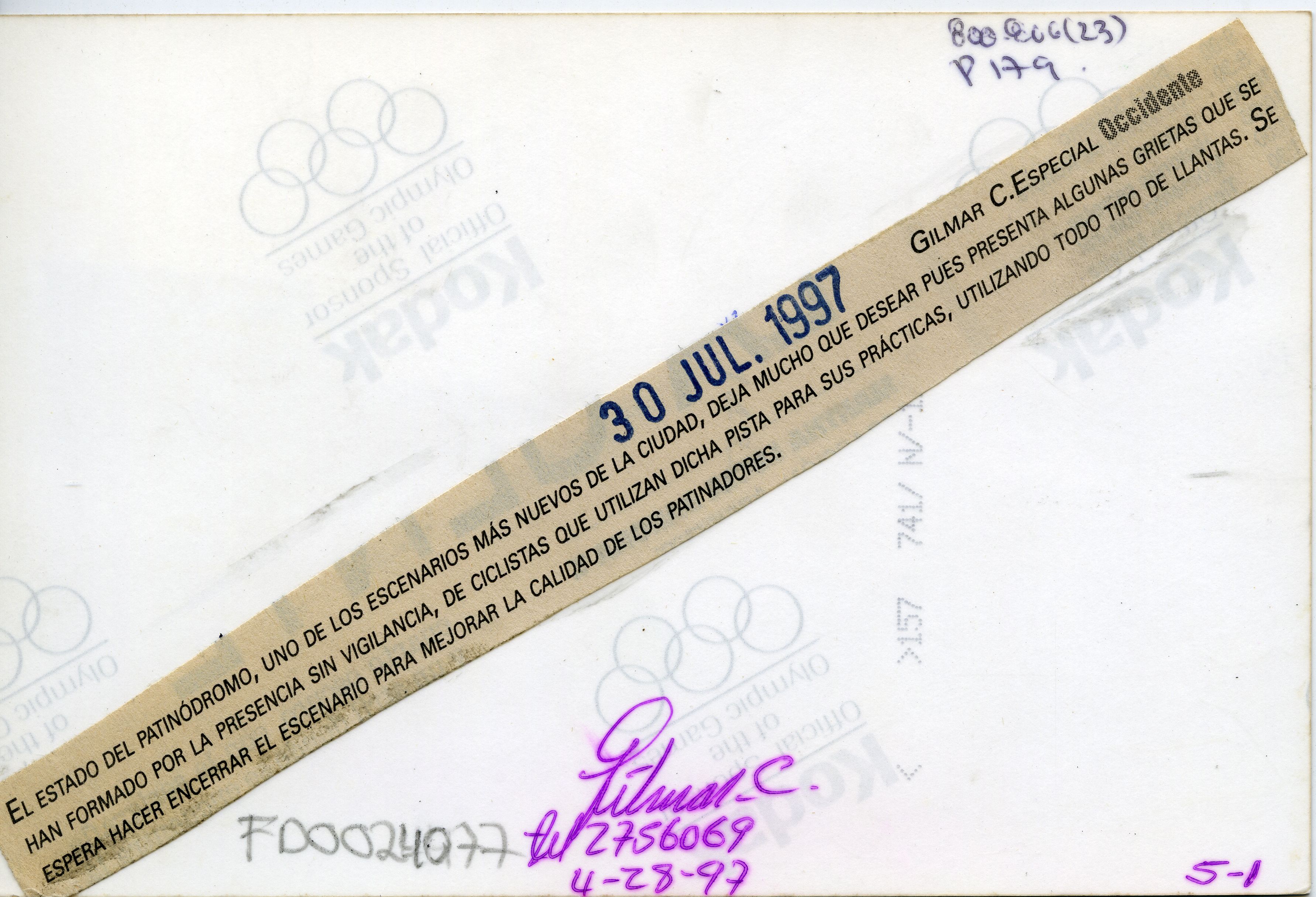 Al reverso de la fotografía se anexa recorte: El estado del Patinódromo, uno de los escenarios más nuevos de la ciudad deja mucho que desear pues presenta algunas grietas que se han formado por la presencia de vigilancia, de ciclistas que utilizan dicha pista para sus Prácticas, utilizando todo tipo de llantas. Se espera hacer encerrar el escenario para hacer mejorar la calidad de los patinadores