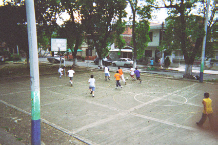 Plano medio. Picado. Un grupo de niños juega fútbol en en un parque. La imagen es tomada en exterior. Al fondo se observan algunos árboles frondosos y la fachada de algunas viviendas con algunos vehículos estacionados frente a ellas.