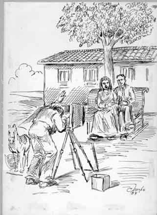 Dibujo a plumilla que representa a "foto agüita" en acción en el parque. Ulloa, fecha por identificar.